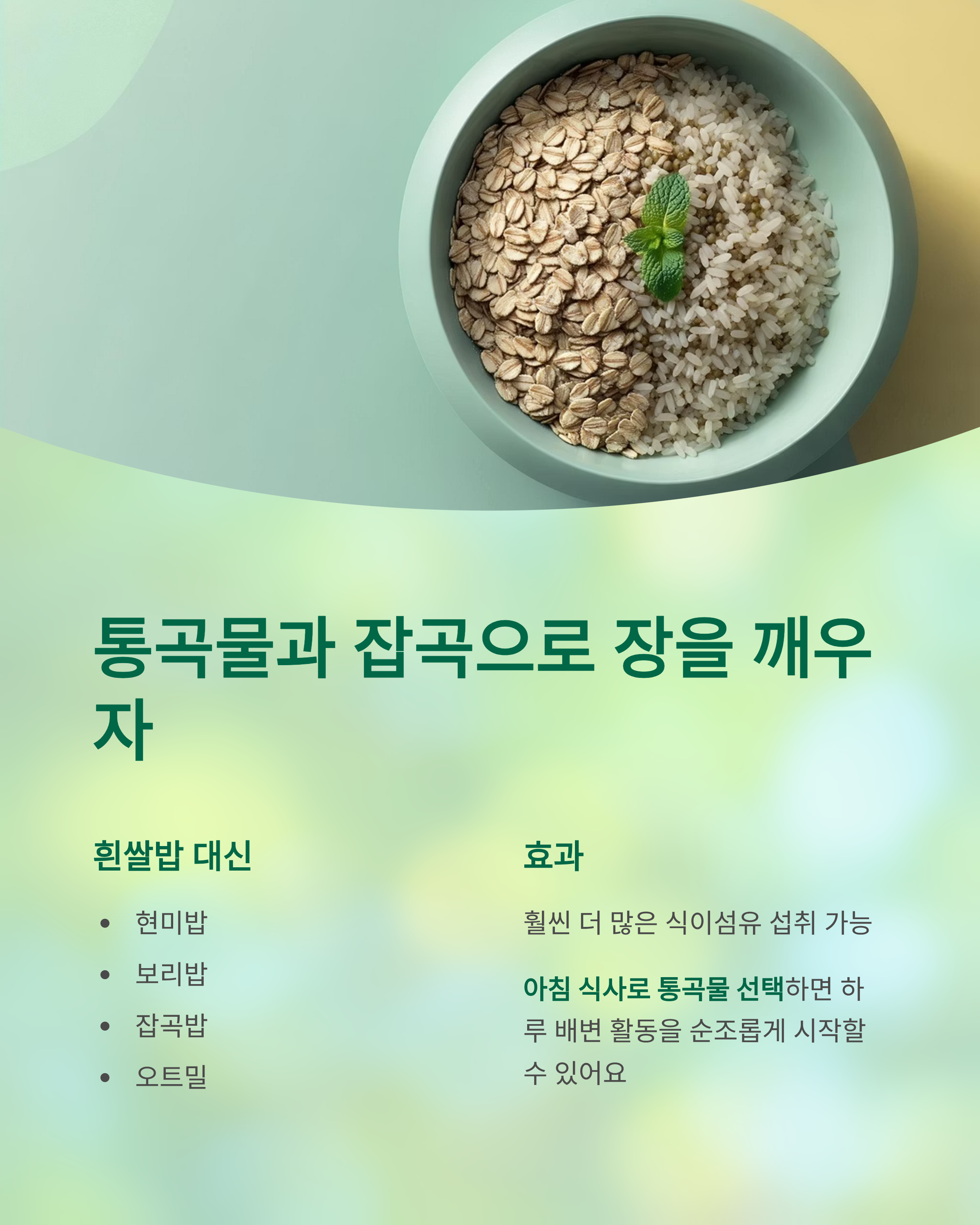 흰쌀밥 대신 현미나 보리밥, 잡곡밥을 먹으면 훨씬 더 많은 식이섬유를 섭취할 수 있습니다. 특히 아침 식사로 오트밀 같은 통곡물을 선택하면 하루 배변 활동을 순조롭게 시작할 수 있어요.