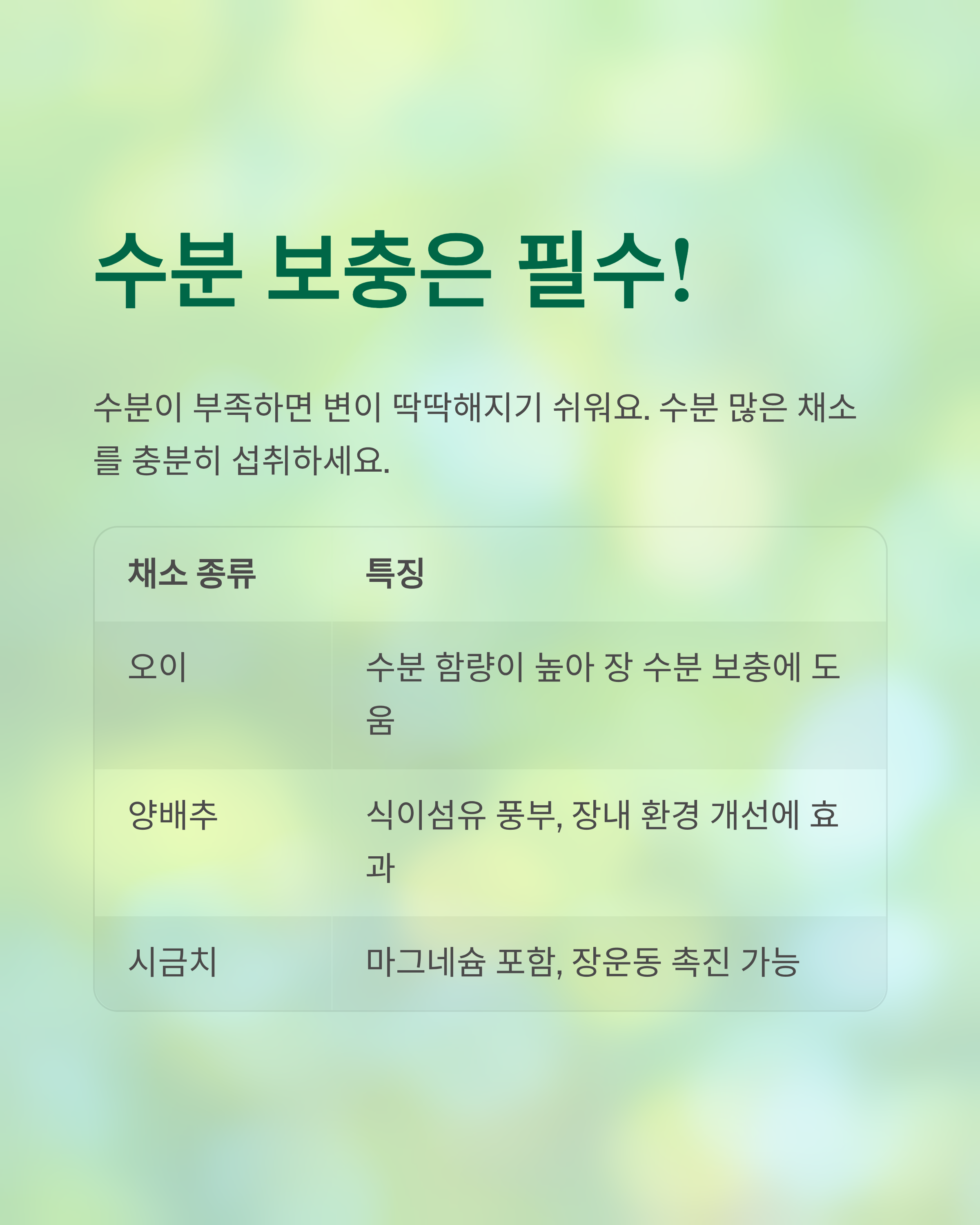 수분이 부족하면 장에서 수분을 너무 많이 흡수해 변이 딱딱해지기 쉬워요. 따라서 채소를 충분히 섭취하는 것이 중요합니다.