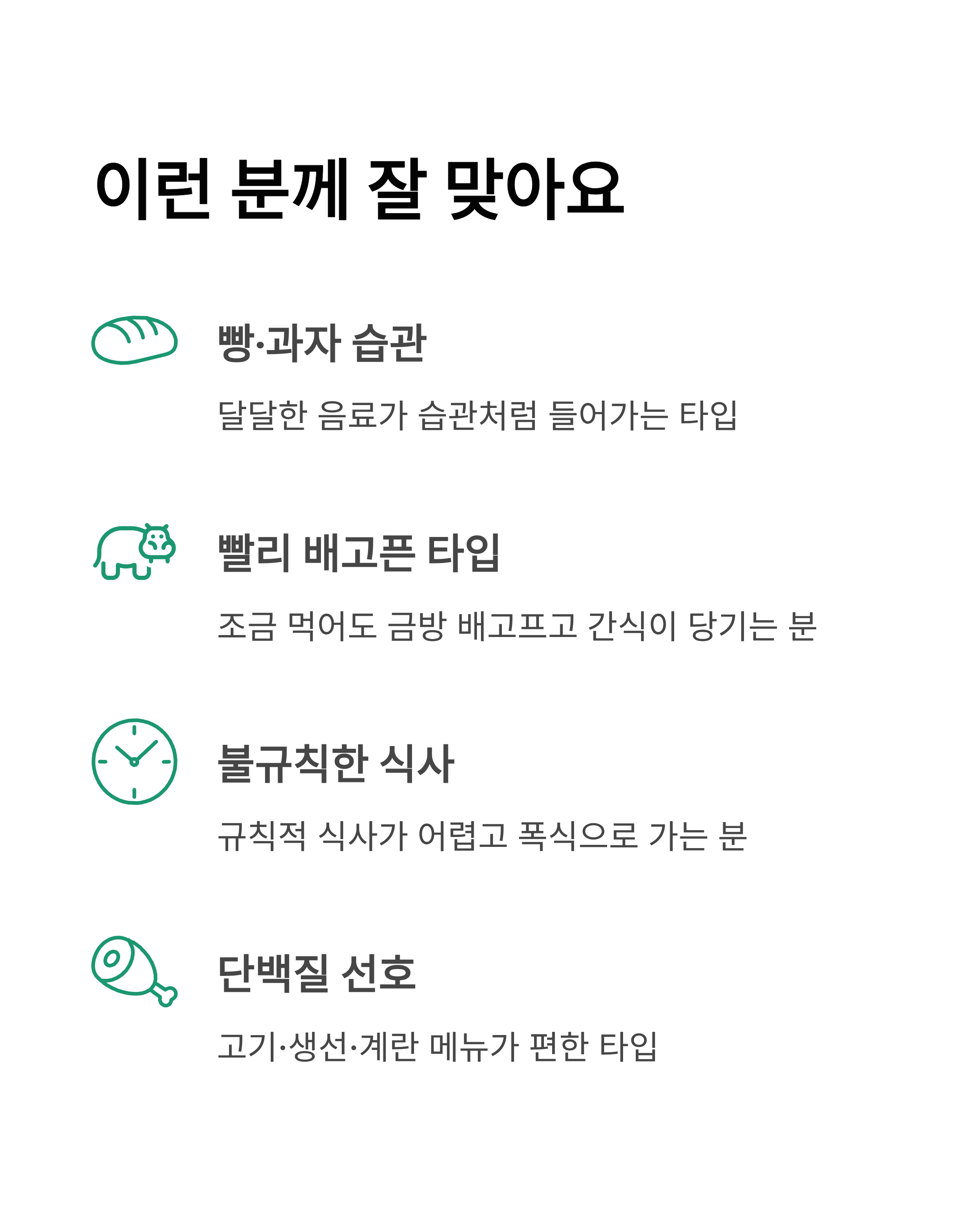 - 단백질/채소 기반 식사를 좋아하거나, 고기·생선·계란 같은 메뉴가 편한 타입