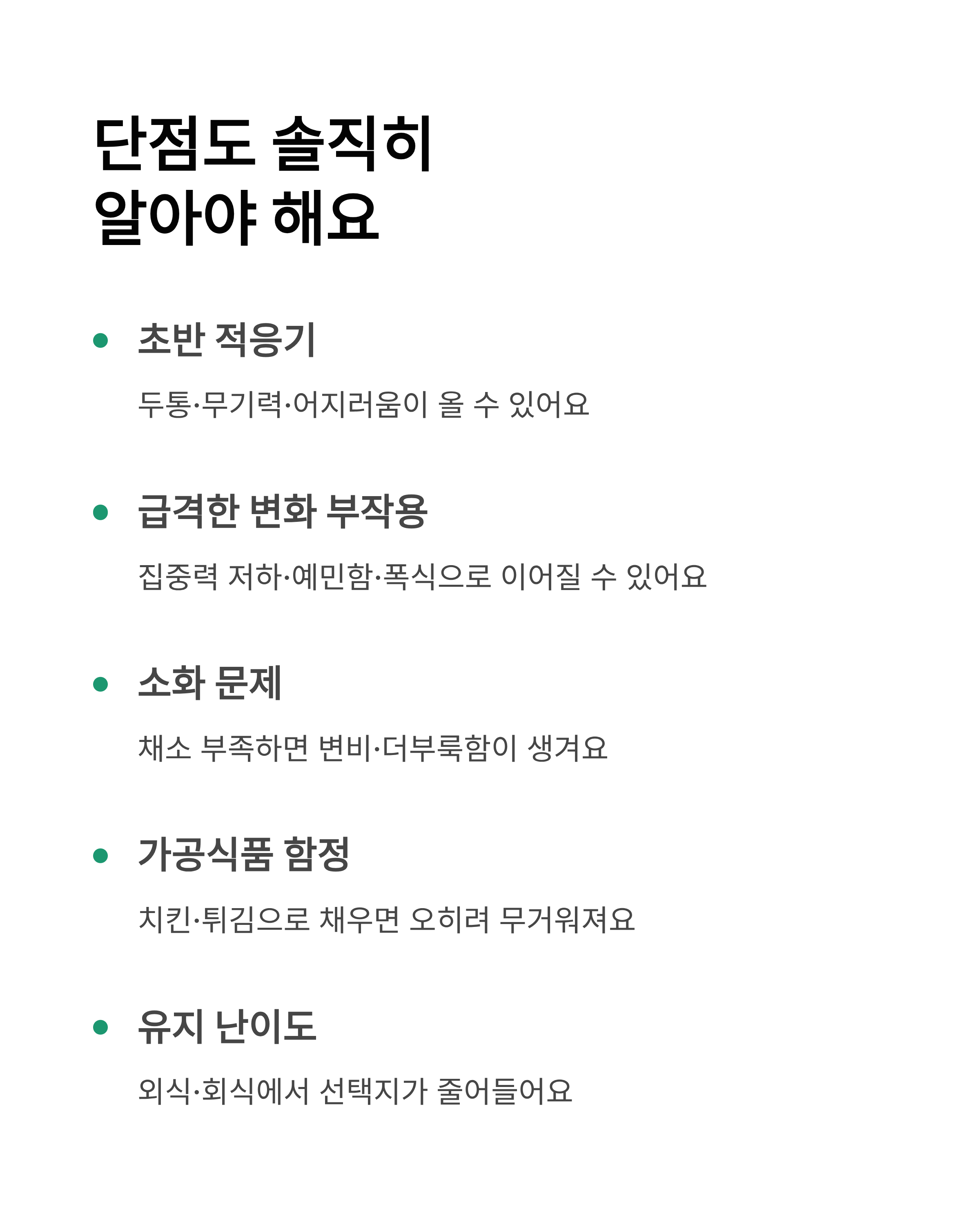 - 초반에 두통·무기력·어지러움 같은 느낌(흔히 ‘적응기’)이 올 수 있음