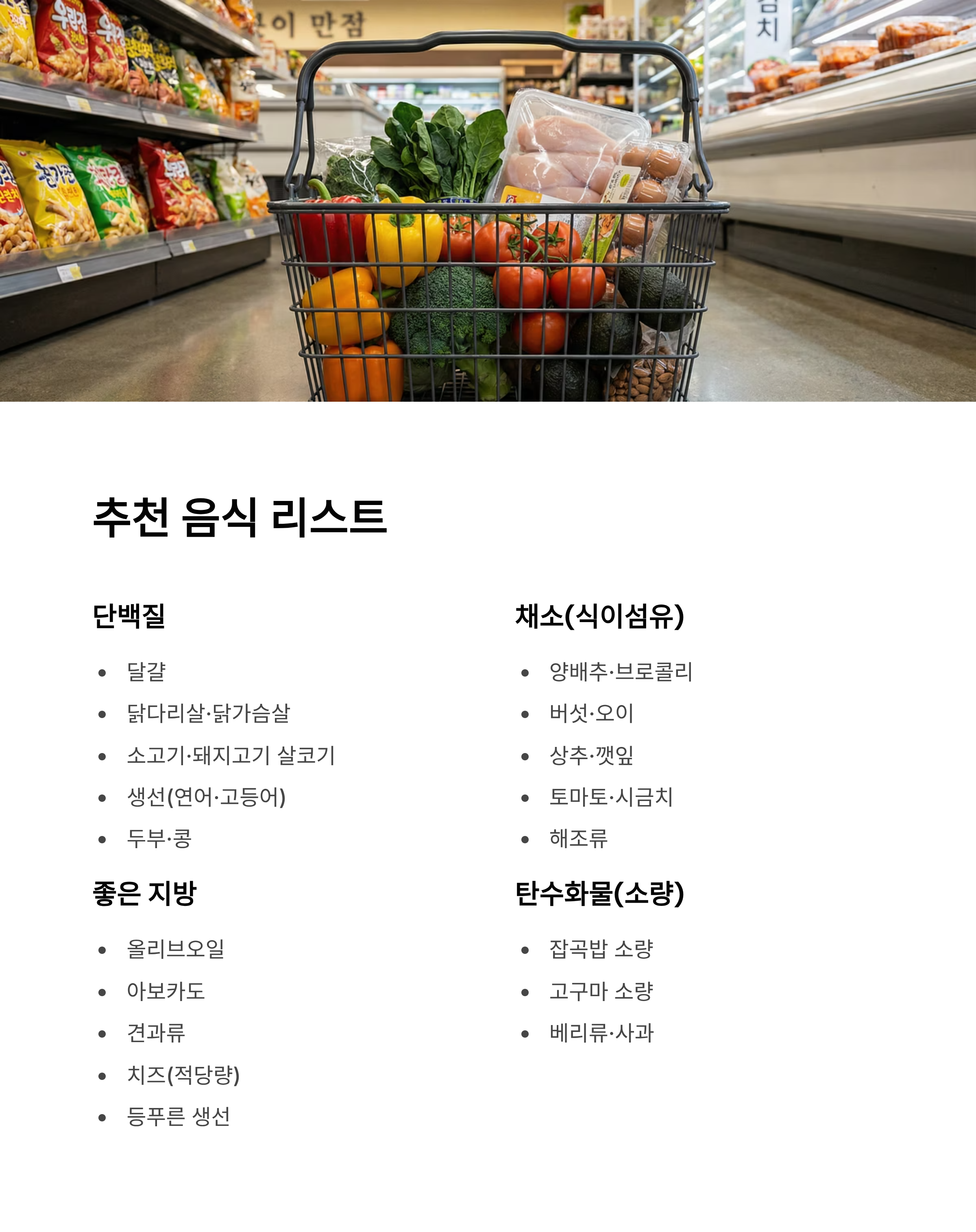 - 달걀, 닭다리살/닭가슴살, 소고기/돼지고기 살코기, 생선(연어·고등어 등), 두부·콩