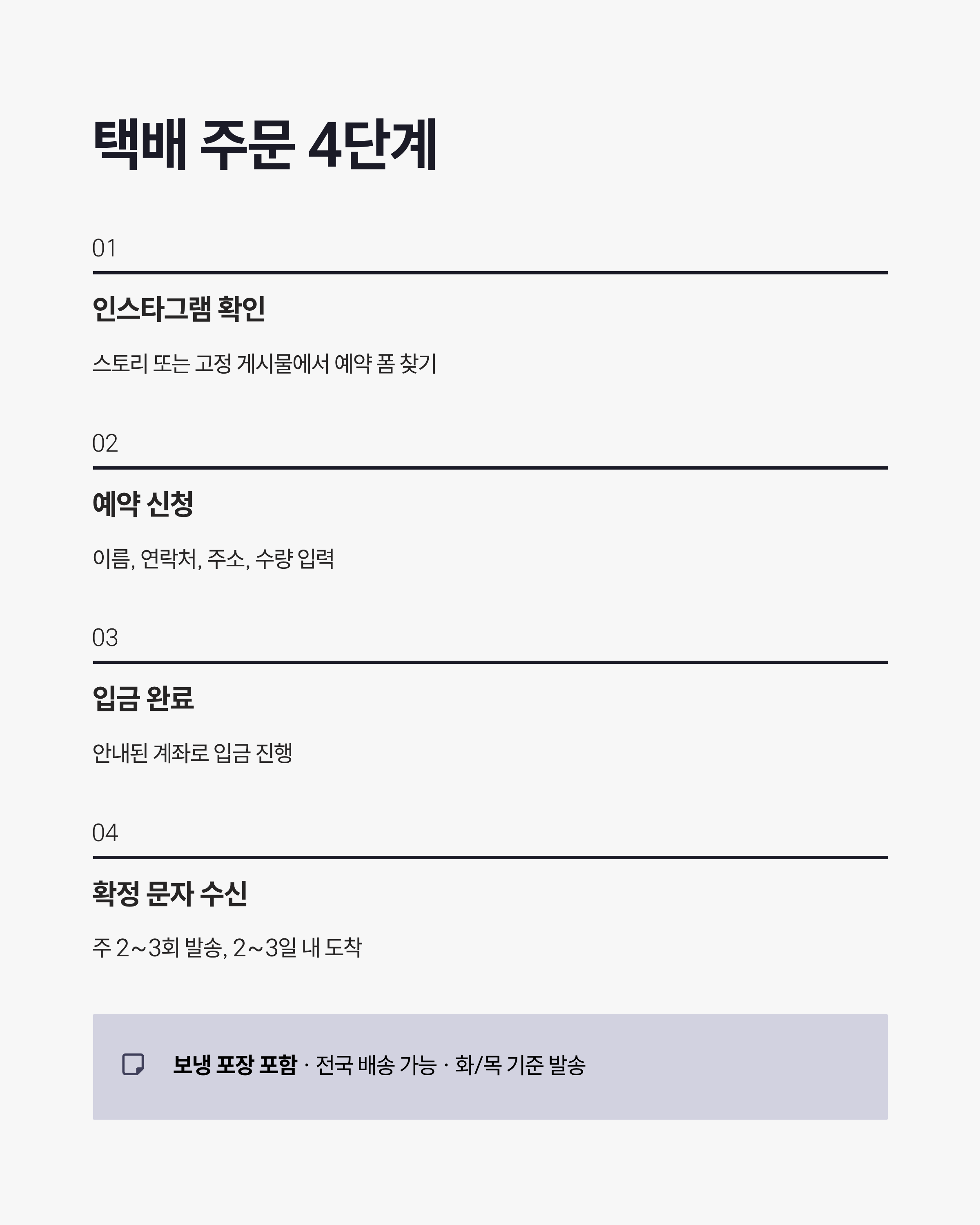 - 보관: 수령 후 냉동 보관 (3일 이상 보관 시 필수)