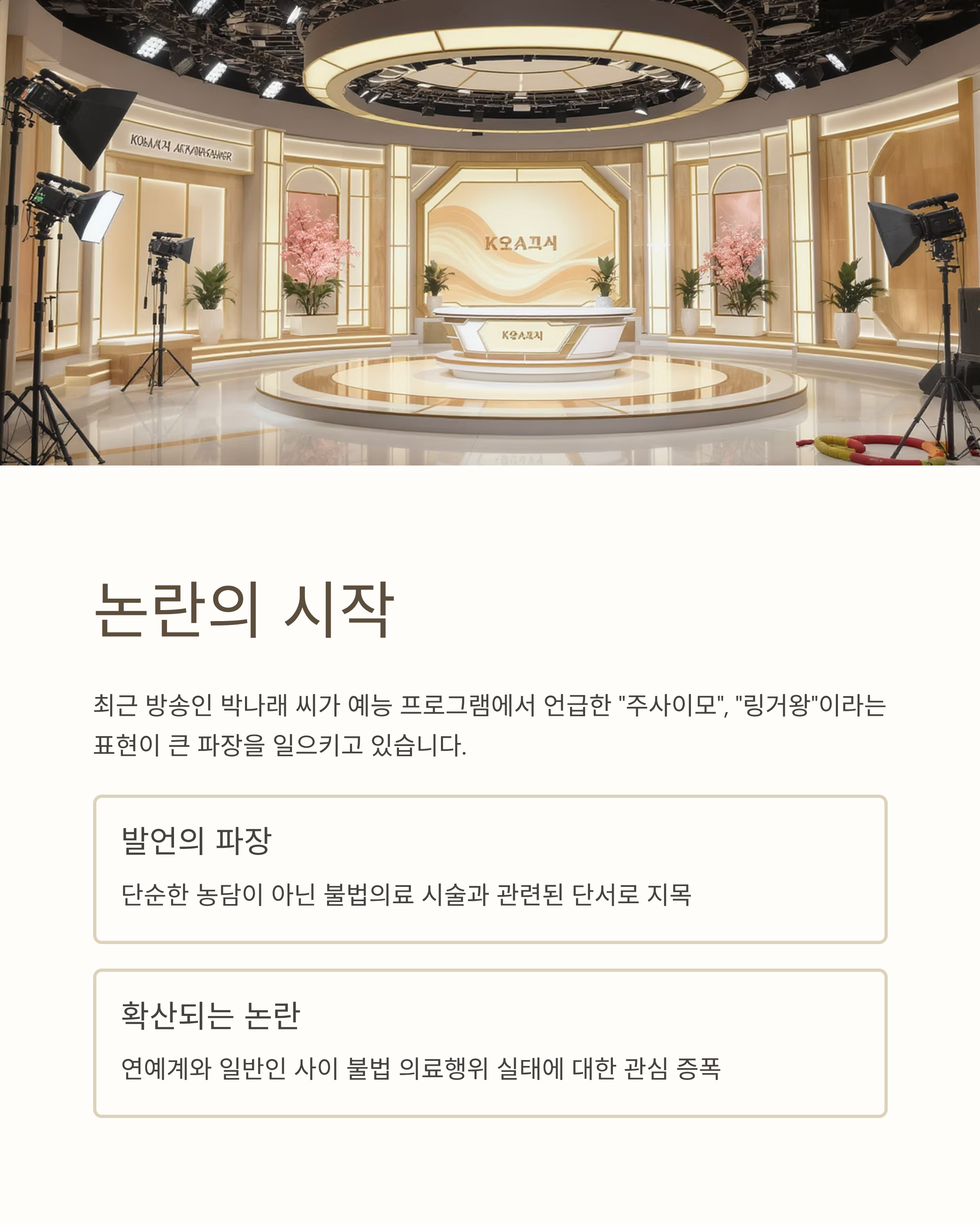 최근 방송인 박나래 씨가 예능 프로그램에서 언급한 "주사이모", "링거왕"이라는 표현이 큰 파장을 일으키고 있습니다. 해당 발언이 단순한 농담으로 받아들여지지 않고, 불법의료 시술과 관련된 단서로 지목되면서 논란이 확산되고 있는데요. 이 사건을 중심으로 불법시술의 문제와 연예계·일반인 사이에서 벌어지는 불법 의료행위의 실태를 짚어봅니다.