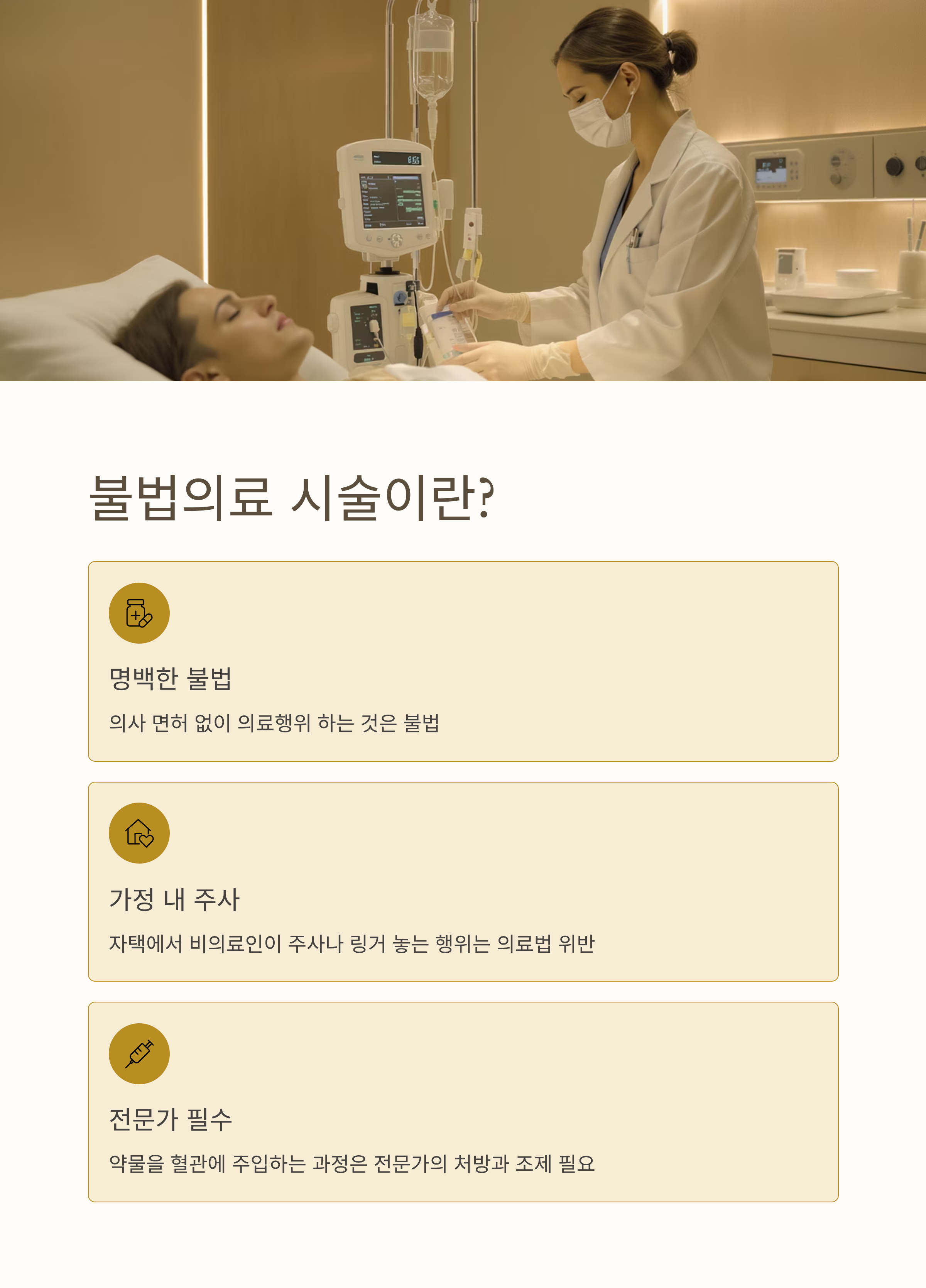 특히 자택에서 비의료인이 주사나 링거를 놓는 행위는 의료법 위반입니다. 설사 해당 주사를 '비타민 주사'라고 불러도, 실제로 약물을 혈관에 주입하는 과정은 전문가의 처방과 조제가 반드시 필요한 영역이죠.
