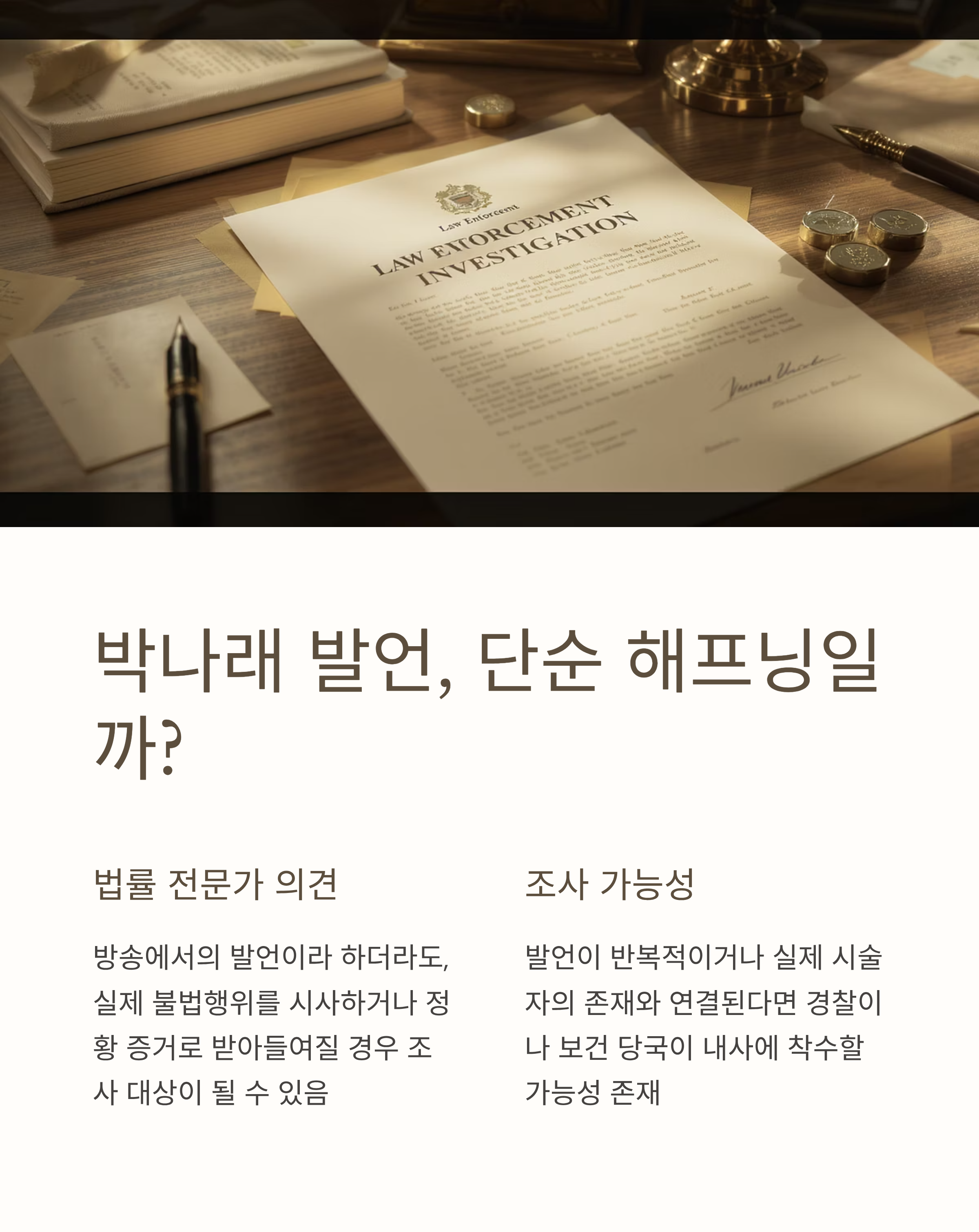 법률 전문가들은 방송에서의 발언이라 하더라도, 그것이 실제 불법행위를 시사하거나 정황 증거로 받아들여질 경우 조사 대상이 될 수 있다고 말합니다.