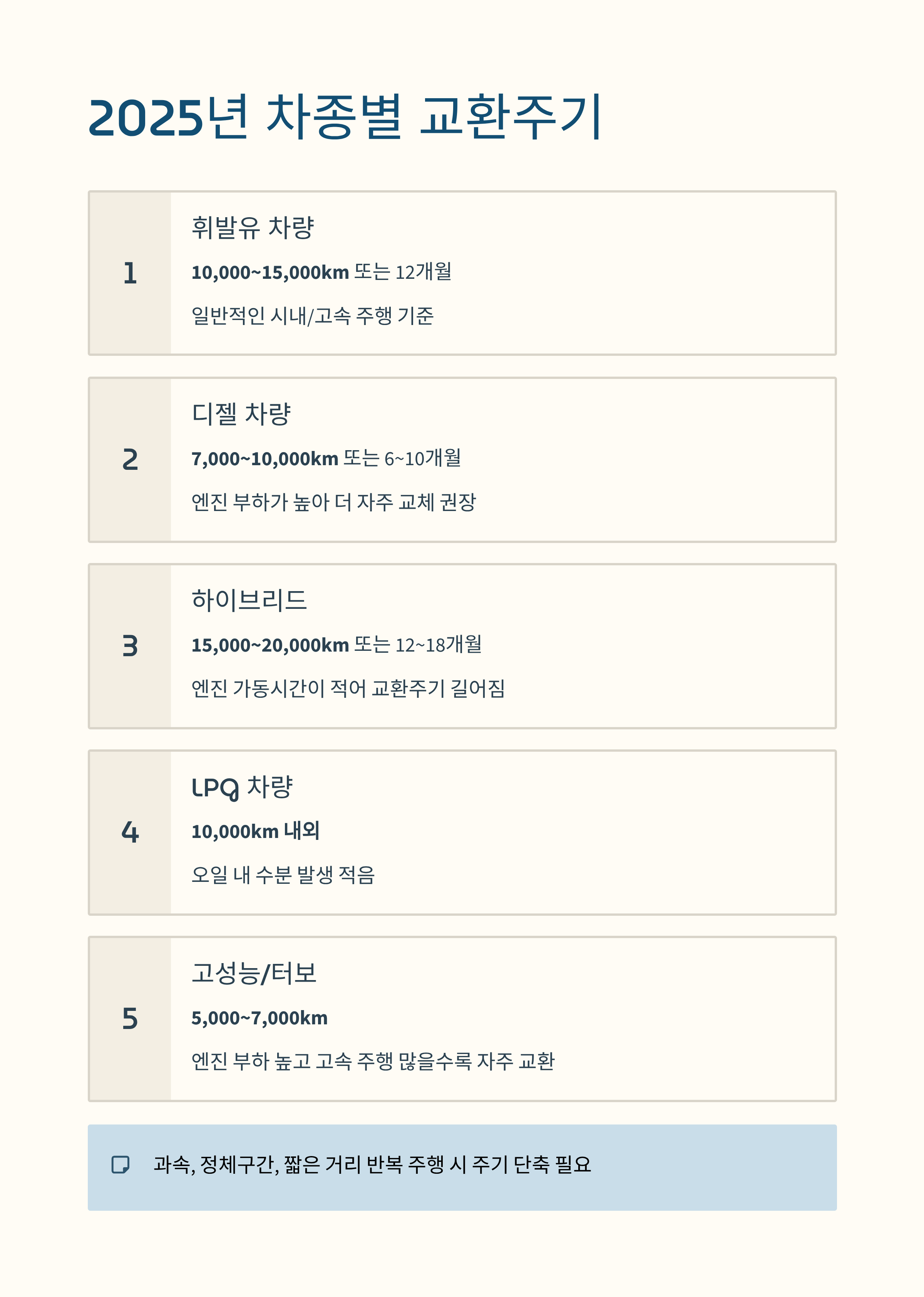 ✅ 운행 조건(과속, 정체구간, 짧은 거리 반복 주행 등)이 심한 경우 주기 단축 필요