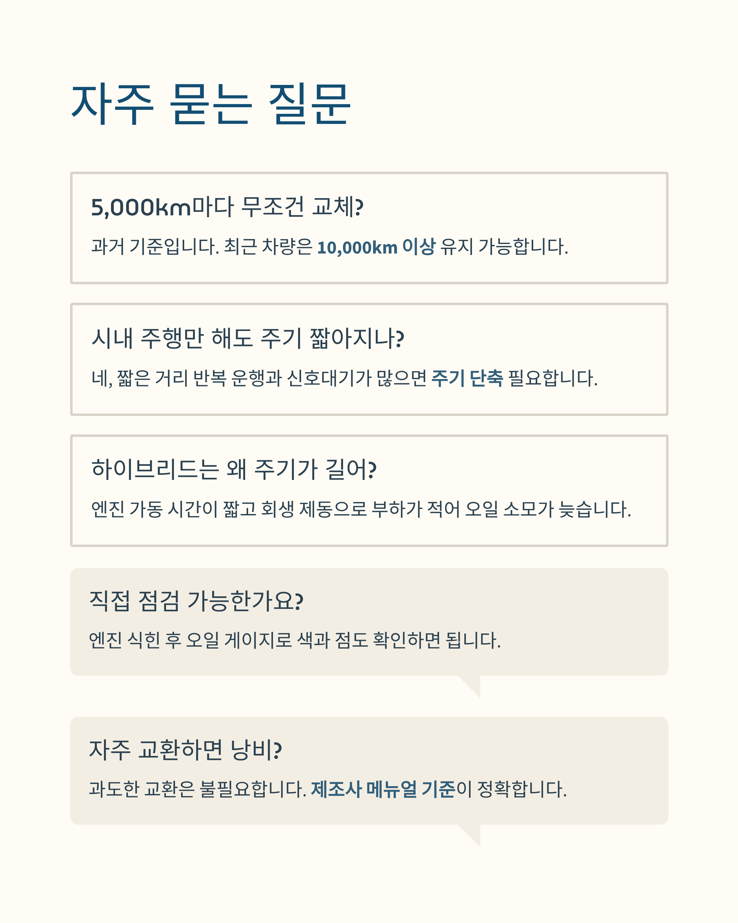 A5. 과도한 교환은 불필요할 수 있습니다. 제조사 메뉴얼 기준 + 운전 습관 반영이 정확합니다.