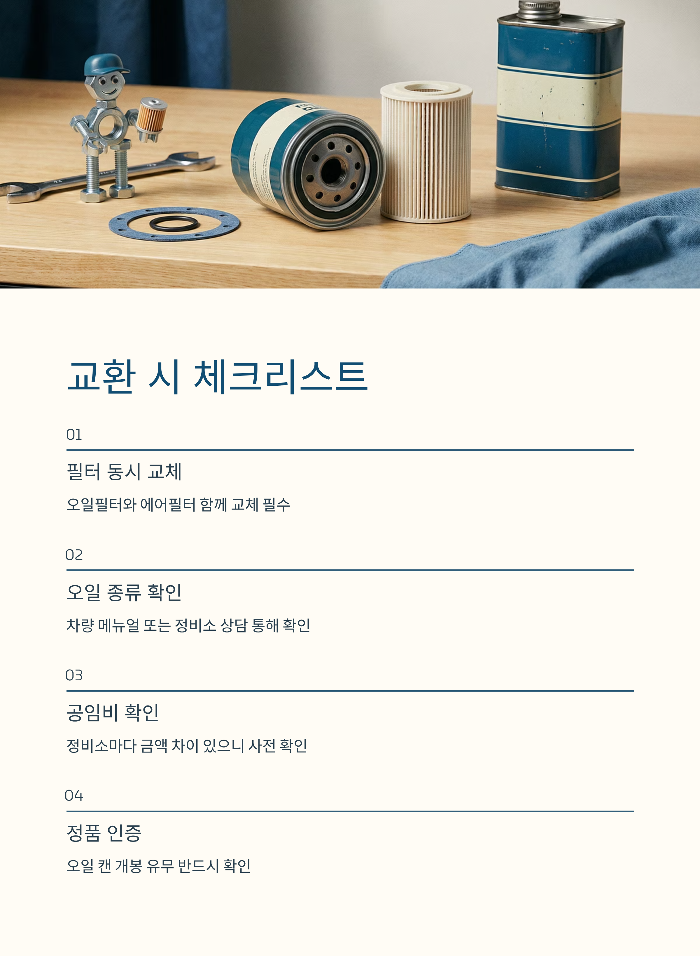 - 필터도 함께 교체: 오일필터/에어필터 교체 필수