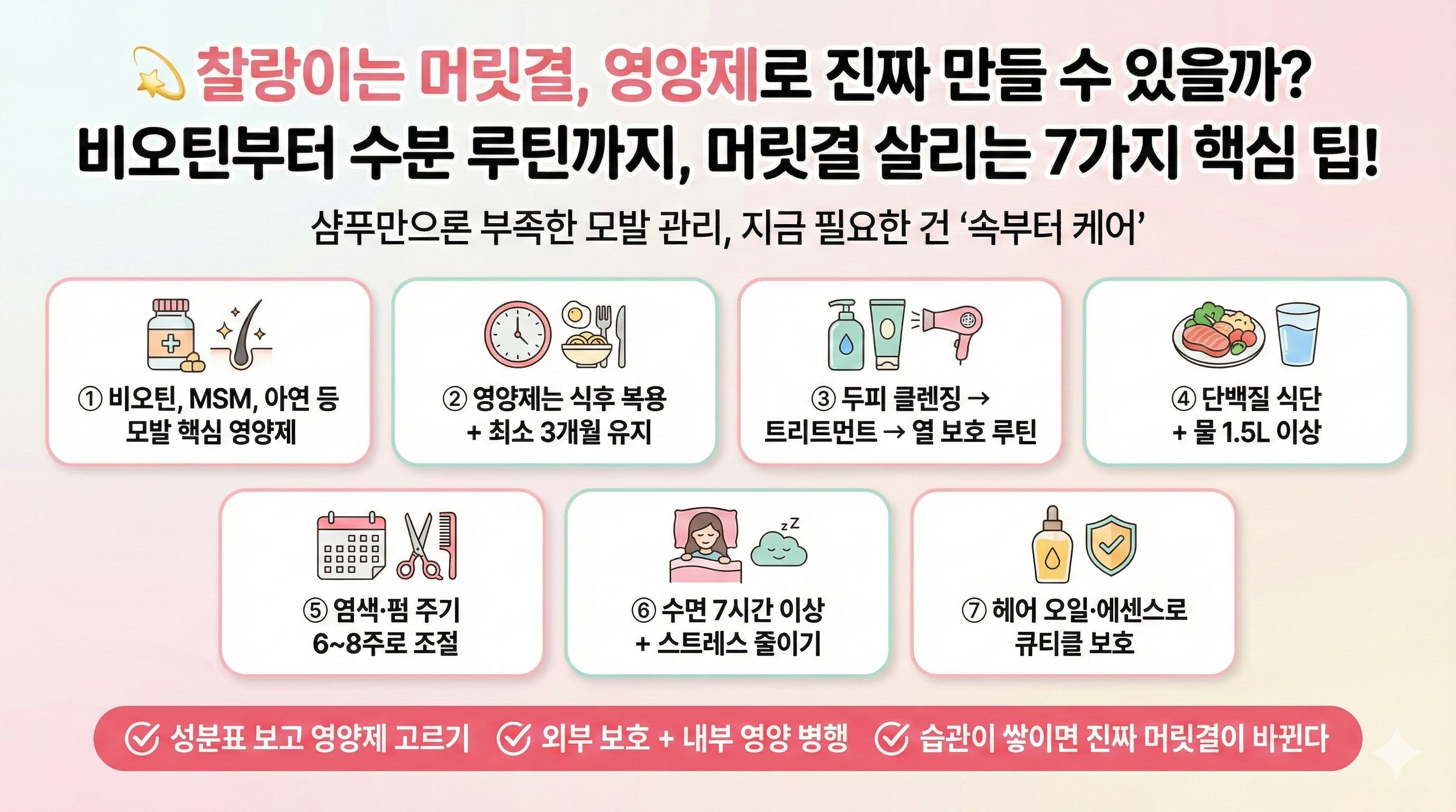 | MSM | 케라틴 강화, 모발 탄력 증가 | 장기 복용 시 효과 ↑ |