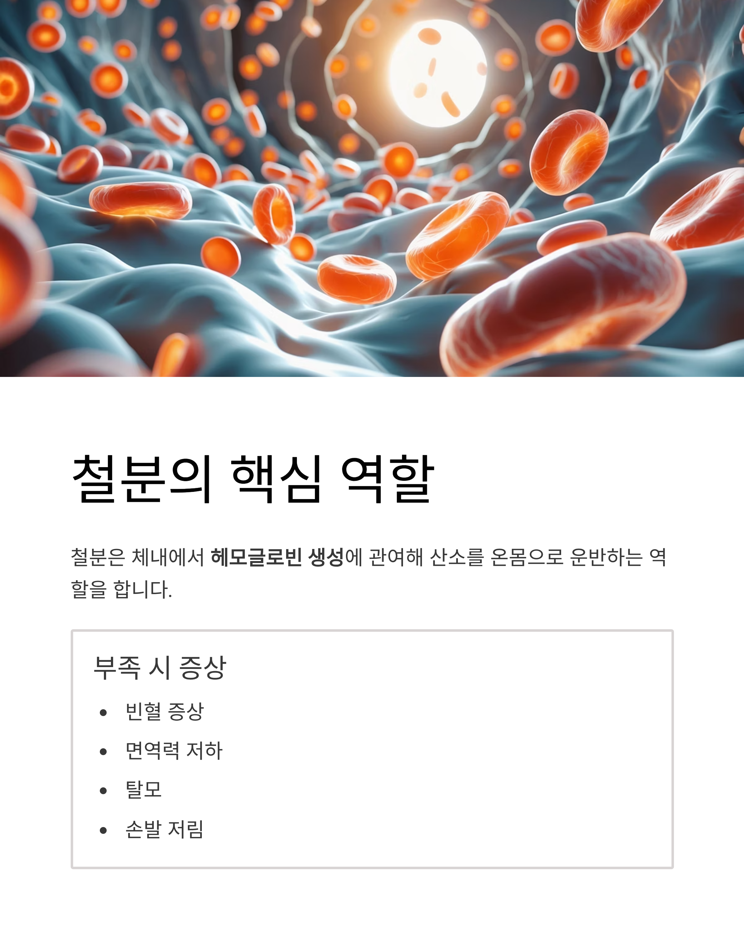 철분은 우리 몸의 혈액 생성과 산소 운반에 중요한 미네랄입니다.