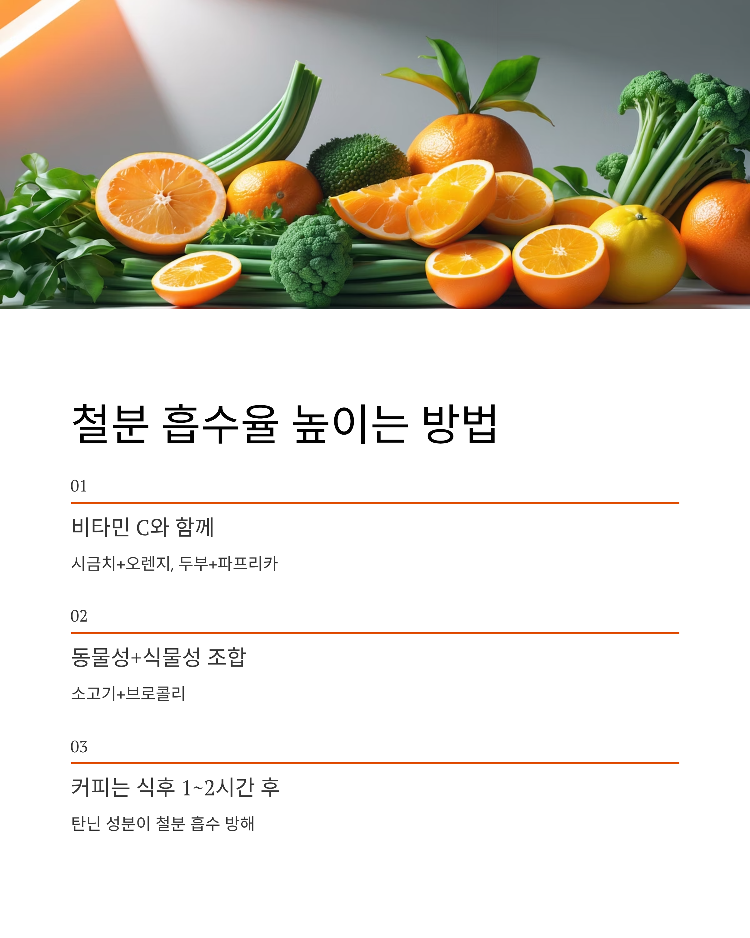 예: 시금치 + 오렌지, 두부 + 파프리카 등 - 동물성 + 식물성 철분 조합
