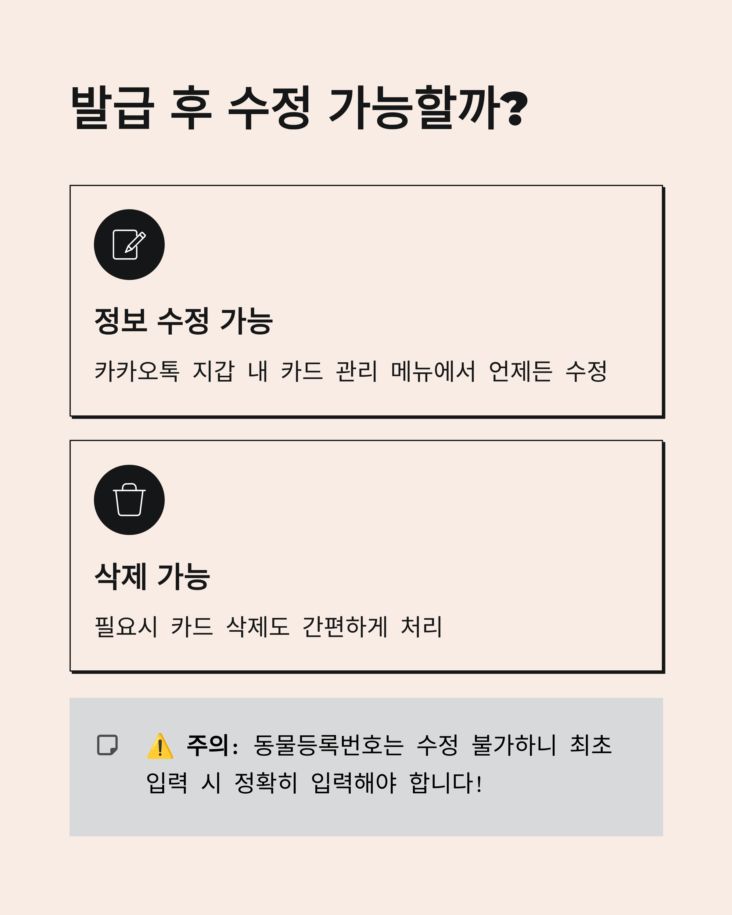 카카오톡 지갑 내 카드 관리 메뉴에서 언제든지 정보 수정 및 삭제가 가능합니다. 단, 동물등록번호는 수정 불가하니 최초 입력 시 정확히 입력해야 해요.