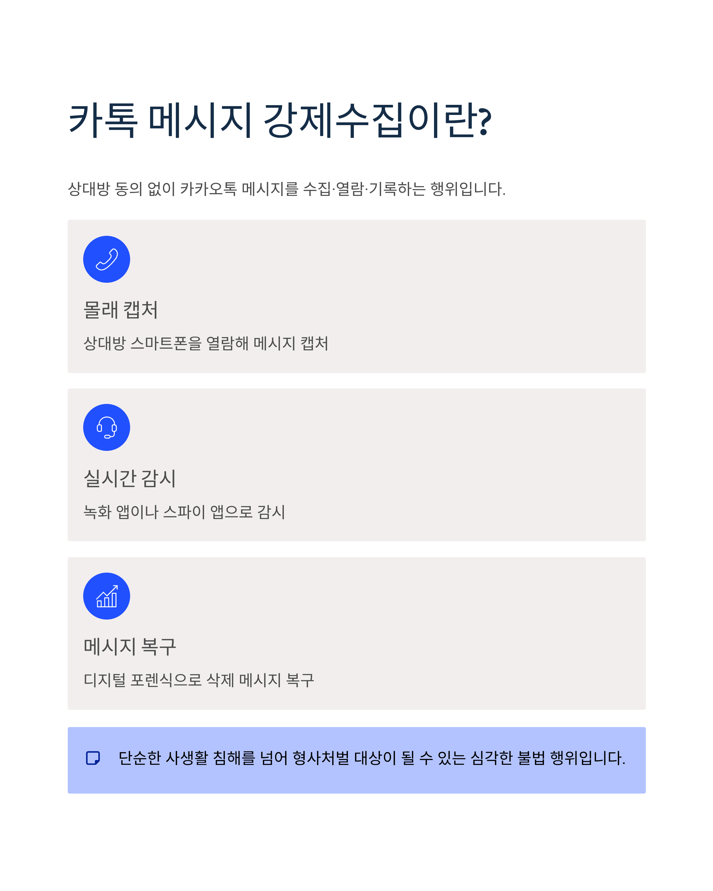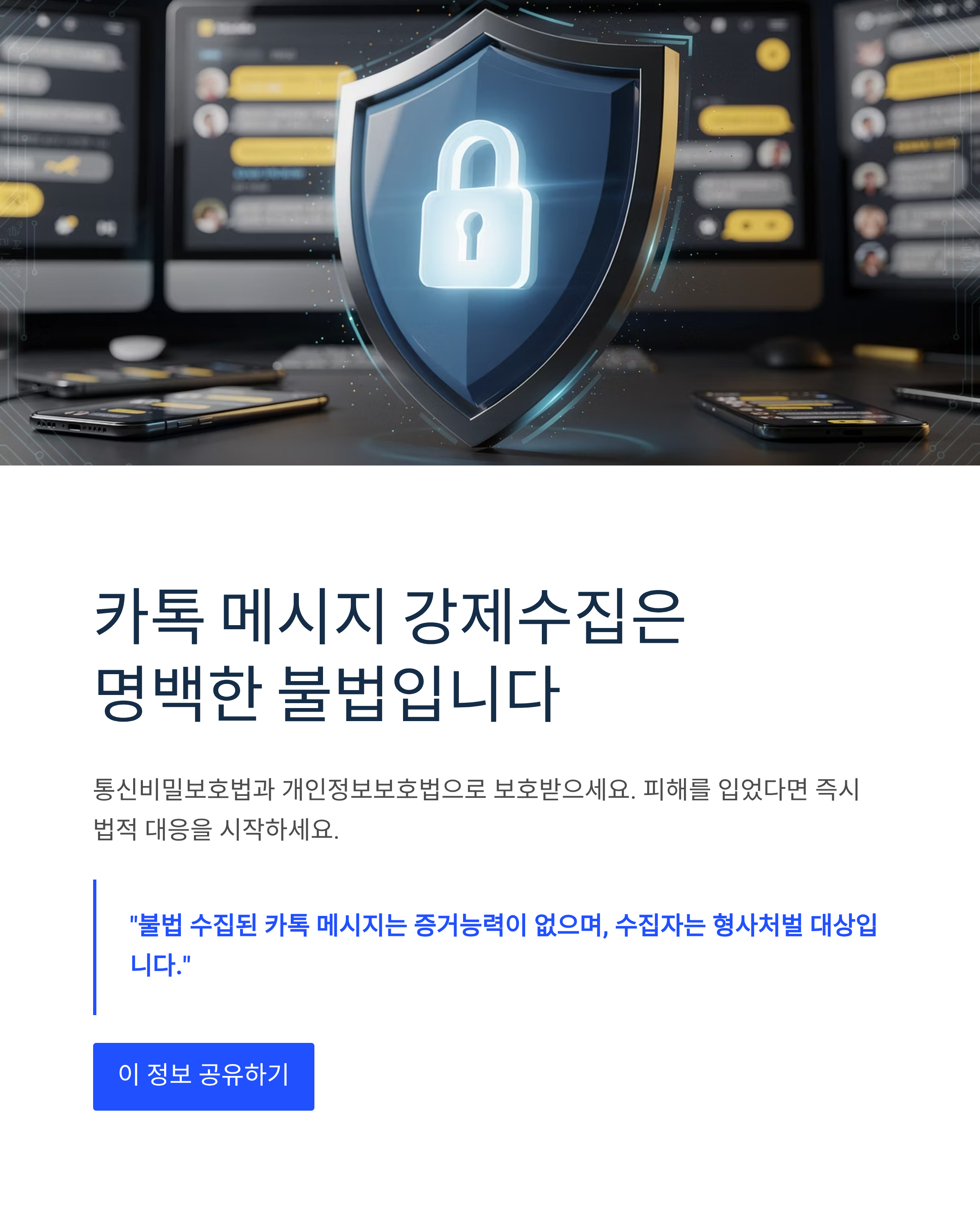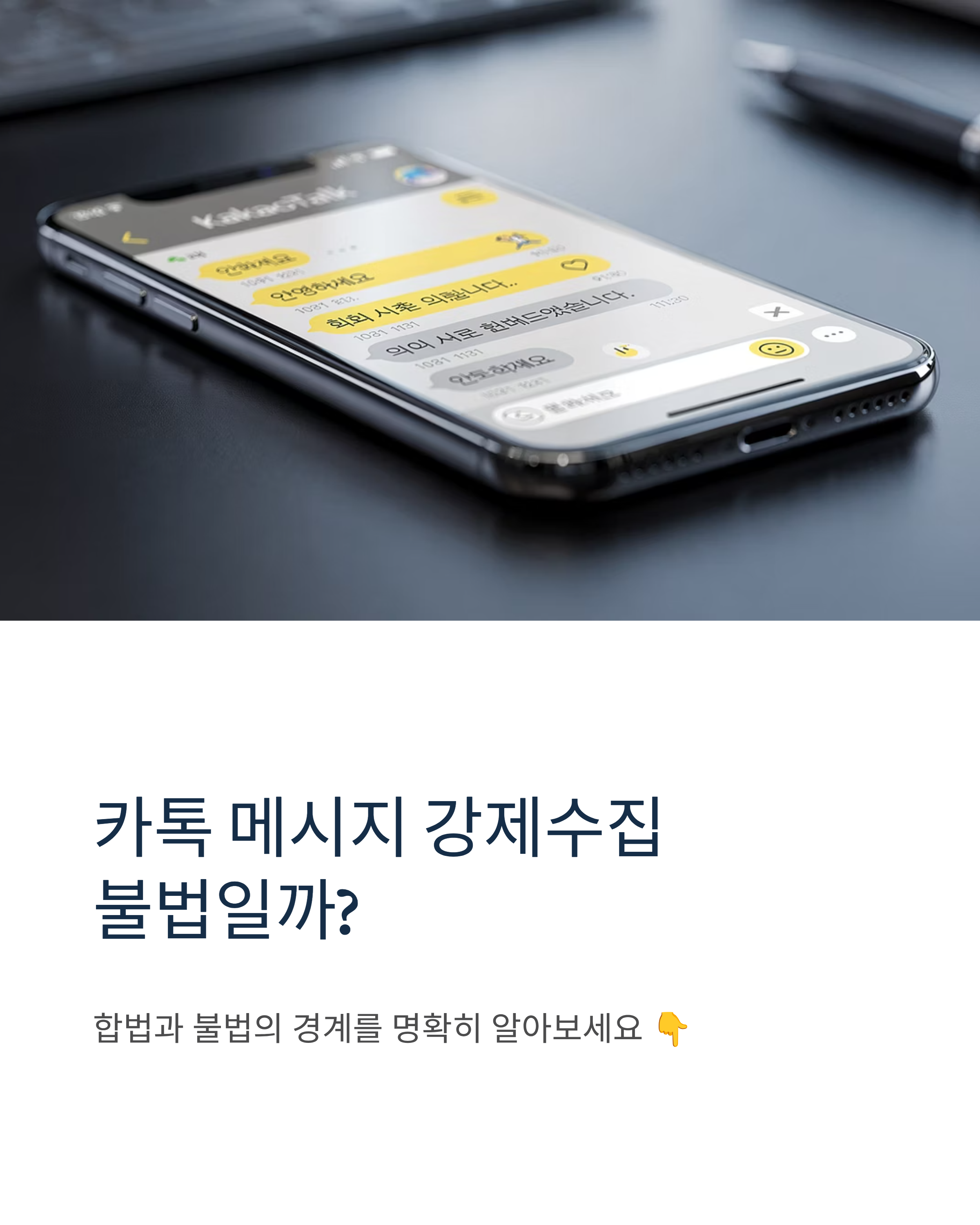 카톡 메시지를 몰래 수집하거나 캡처하는 것은 합법일까? 통신비밀보호법 및 개인정보보호법 관점에서 ‘카톡 메시지 강제수집’의 위법성과 처벌 사례, 대응 방법까지 자세히 설명합니다.