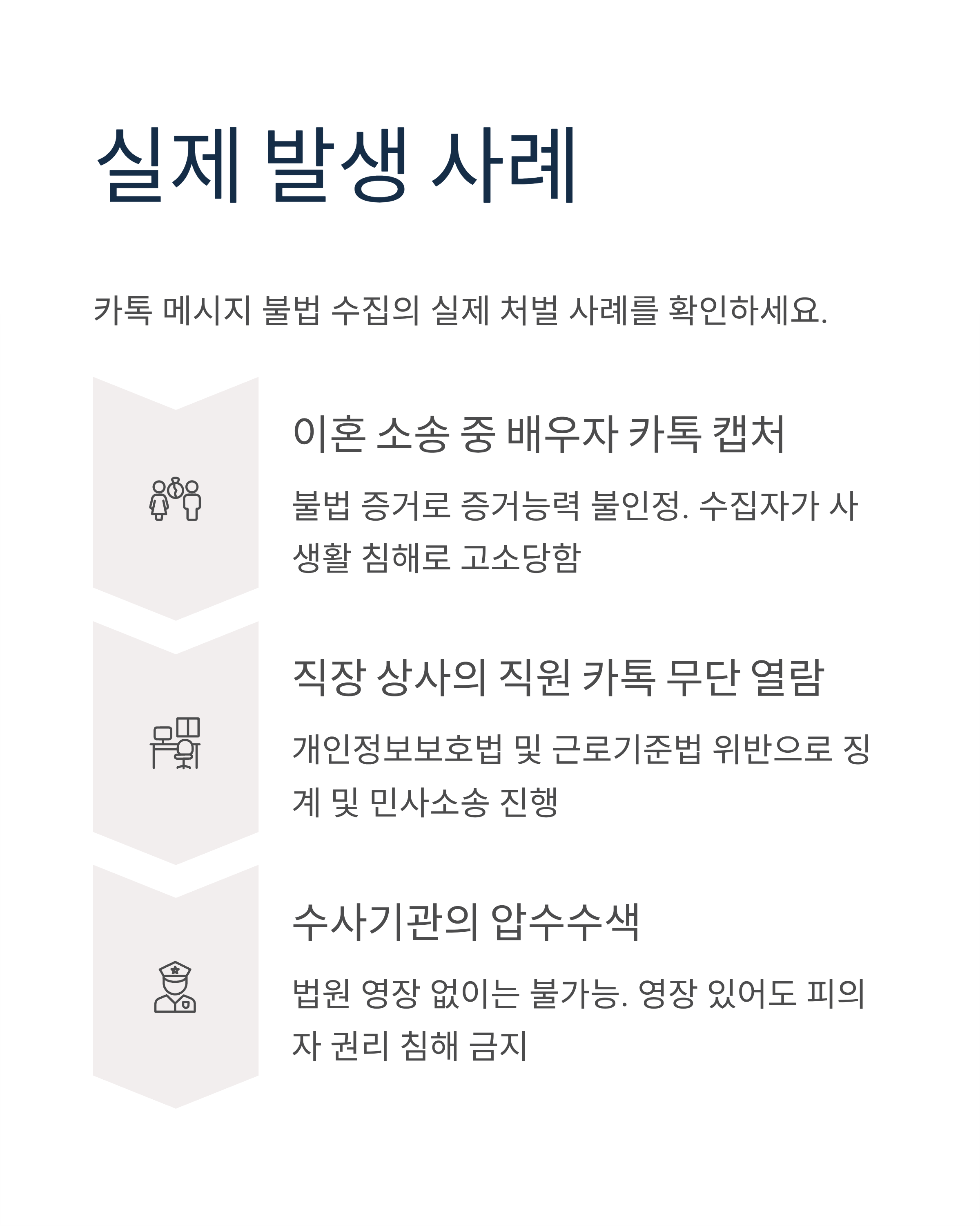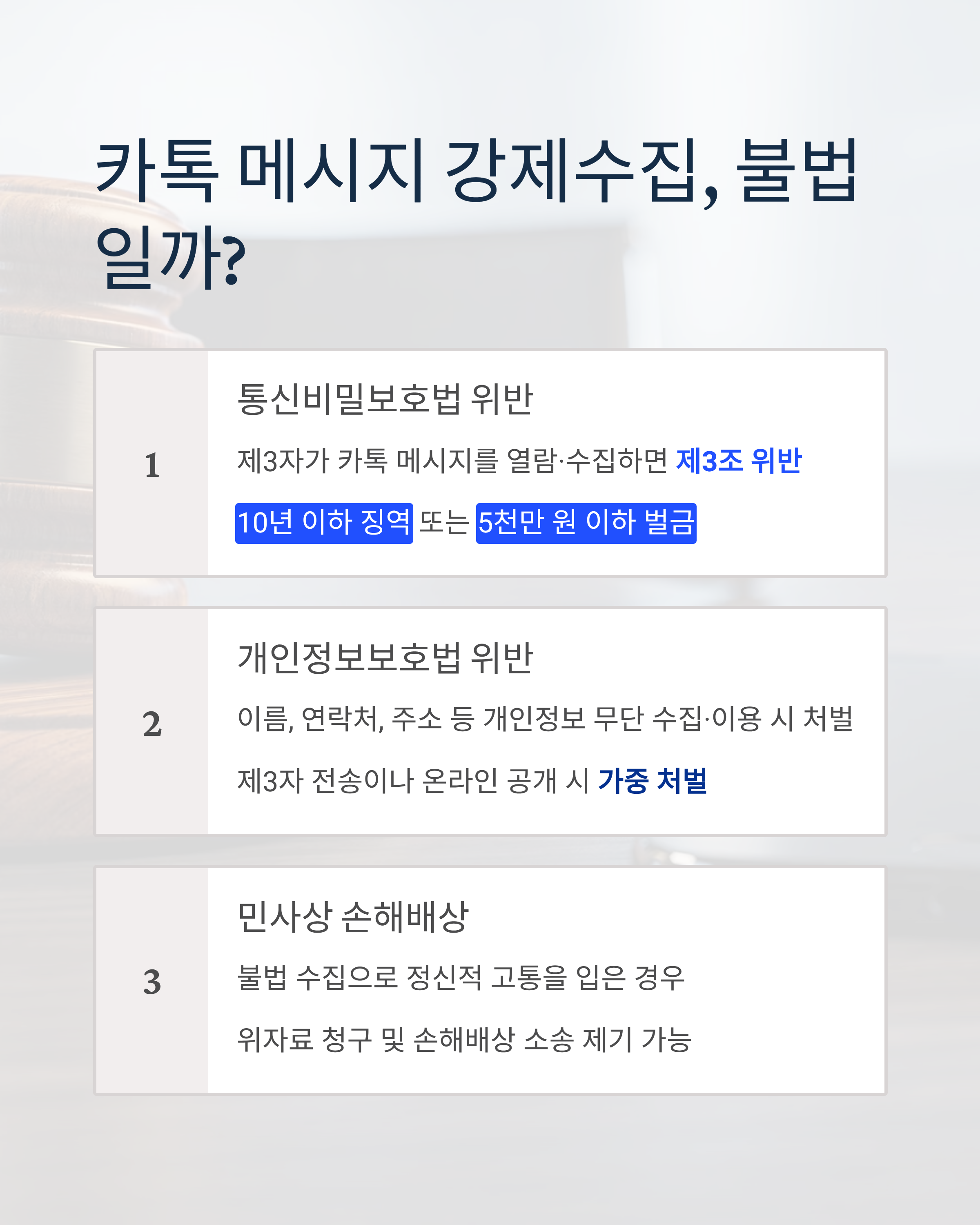 - 불법적으로 수집한 메시지로 피해자가 정신적 고통을 입은 경우, 위자료 청구 및 손해배상 소송 제기 가능.