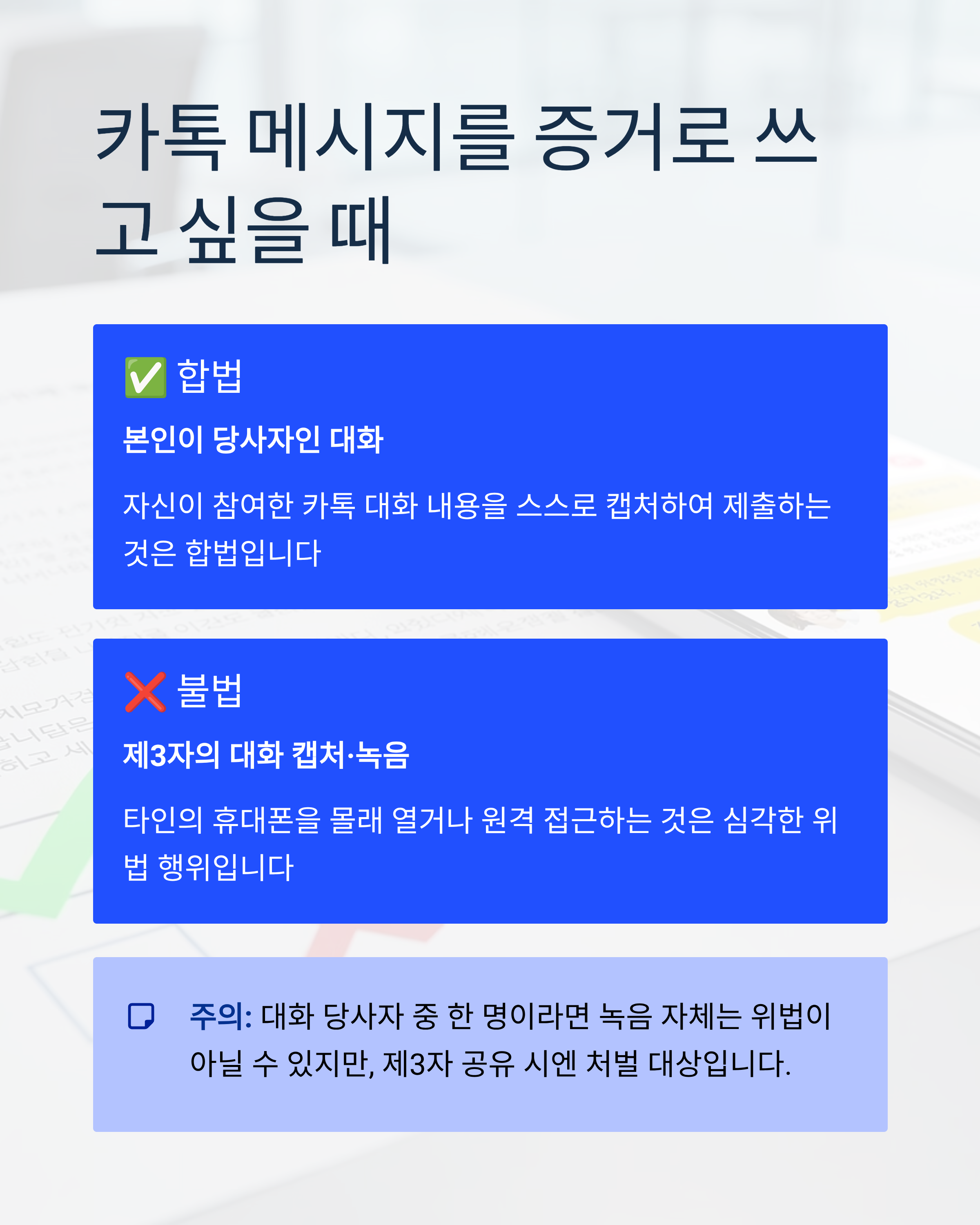 → 자신이 참여한 카톡 대화 내용을 스스로 캡처하여 제출하는 것은 일반적으로 합법입니다. - 제3자의 대화를 몰래 캡처하거나 녹음하면 불법