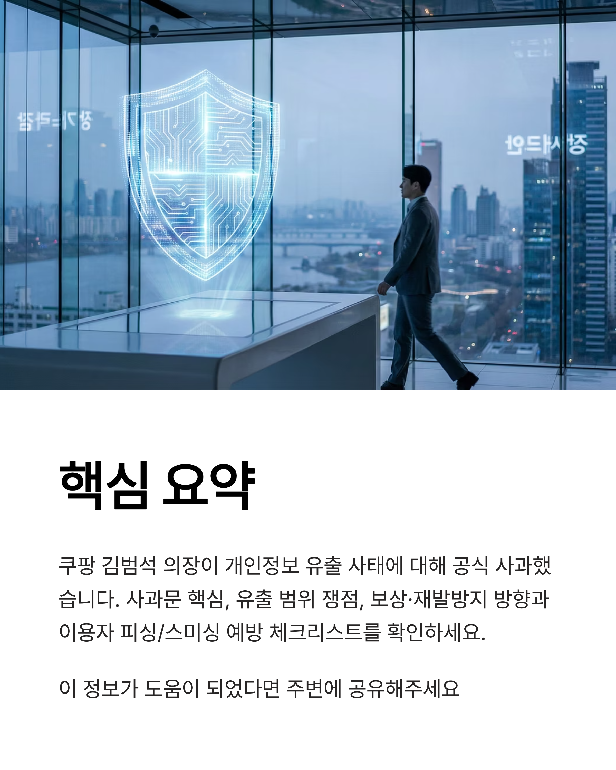메타 설명: 쿠팡 김범석 의장이 개인정보 유출 사태에 대해 2025년 12월 28일 공식 사과했다. 사과문 핵심, 유출 범위 쟁점, 보상·재발방지 방향과 이용자 피싱/스미싱 예방 체크리스트를 정리했다.