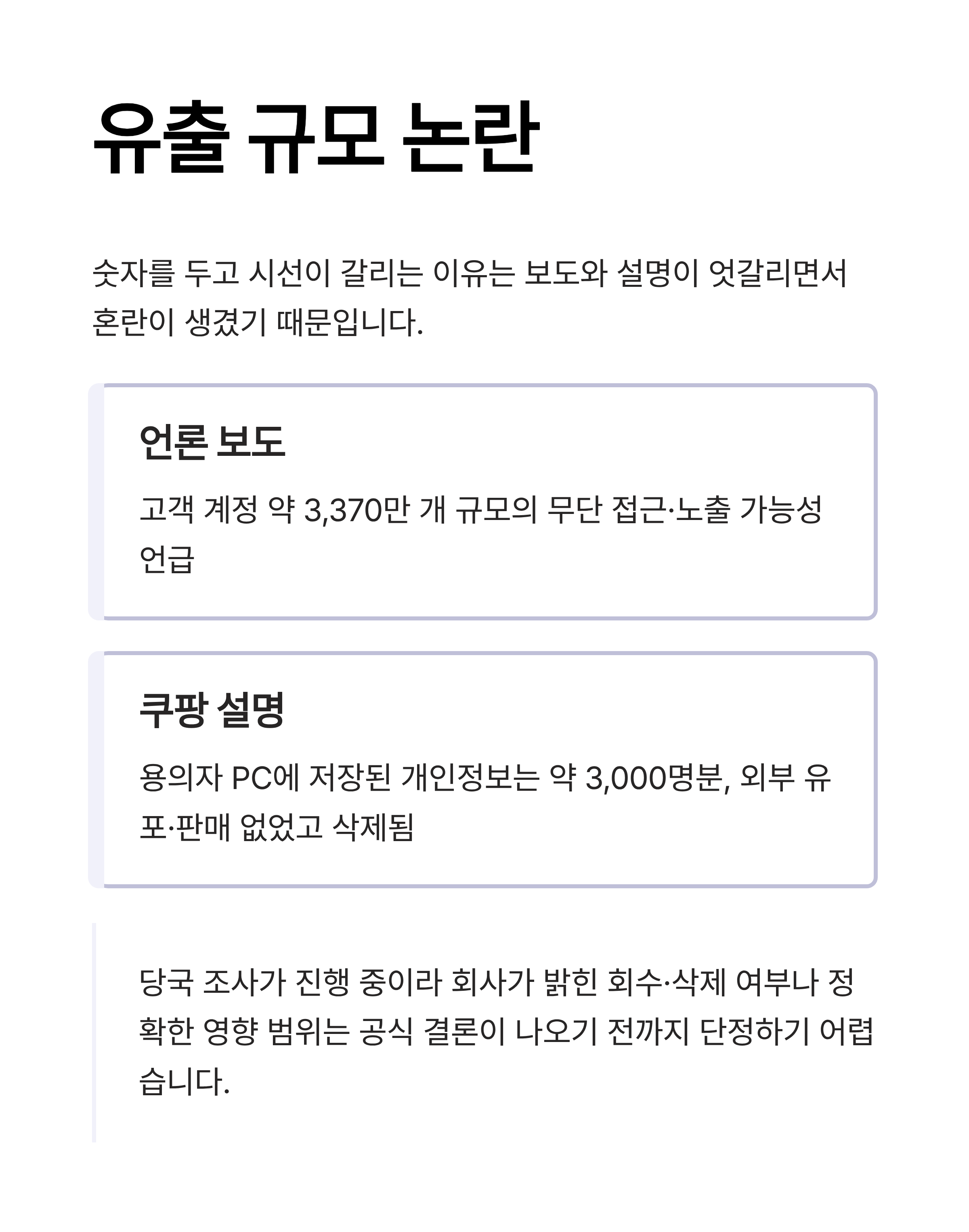 즉, “3,000명만 영향”과 “3,370만이 위험”이 단순히 같은 의미로 충돌한다기보다, 무단 접근 범위 / 실제 저장·반출 / 2차 피해 가능성이 서로 다른 층위로 섞여 해석되고 있는 상황이라고 보는 편이 안전합니다.