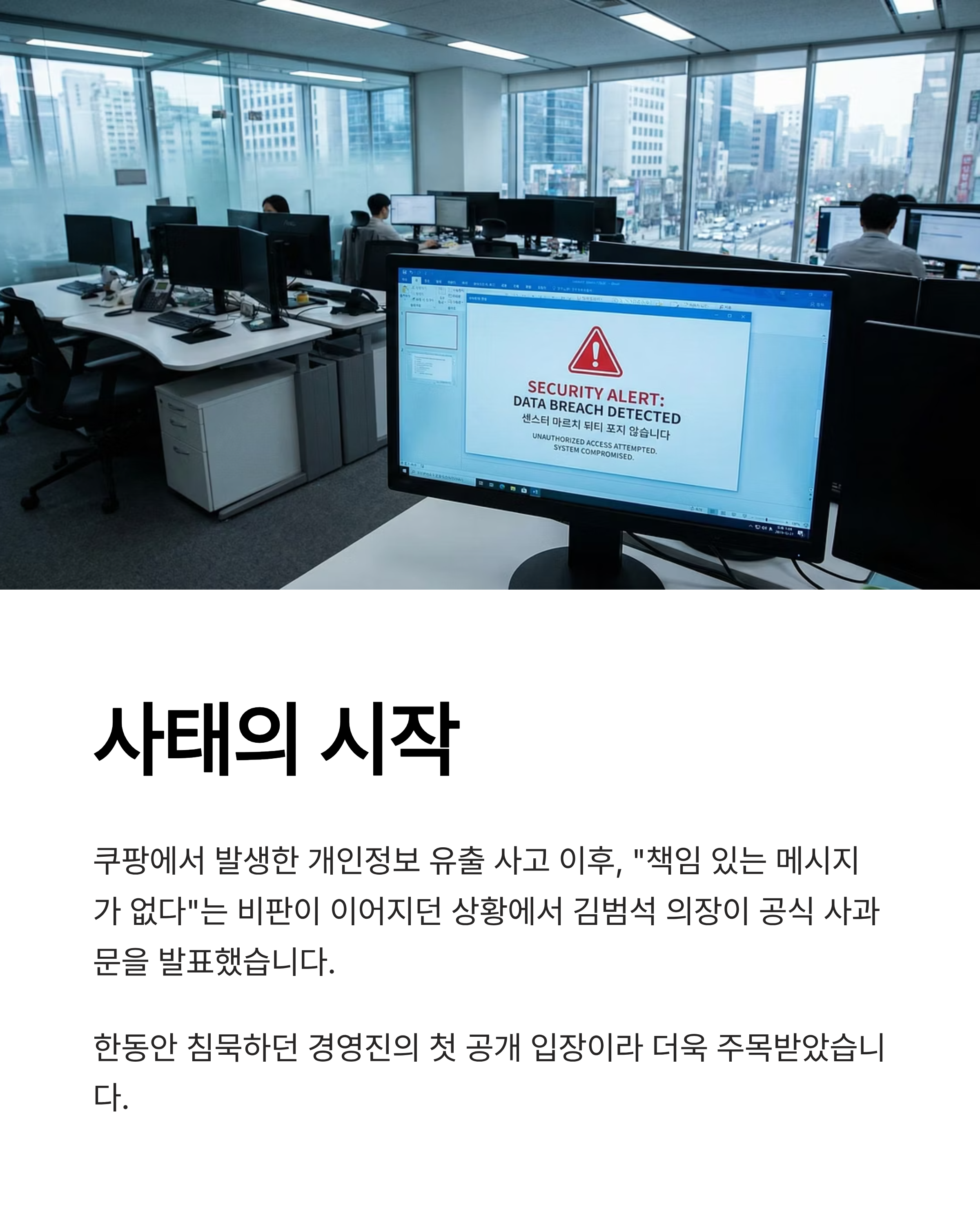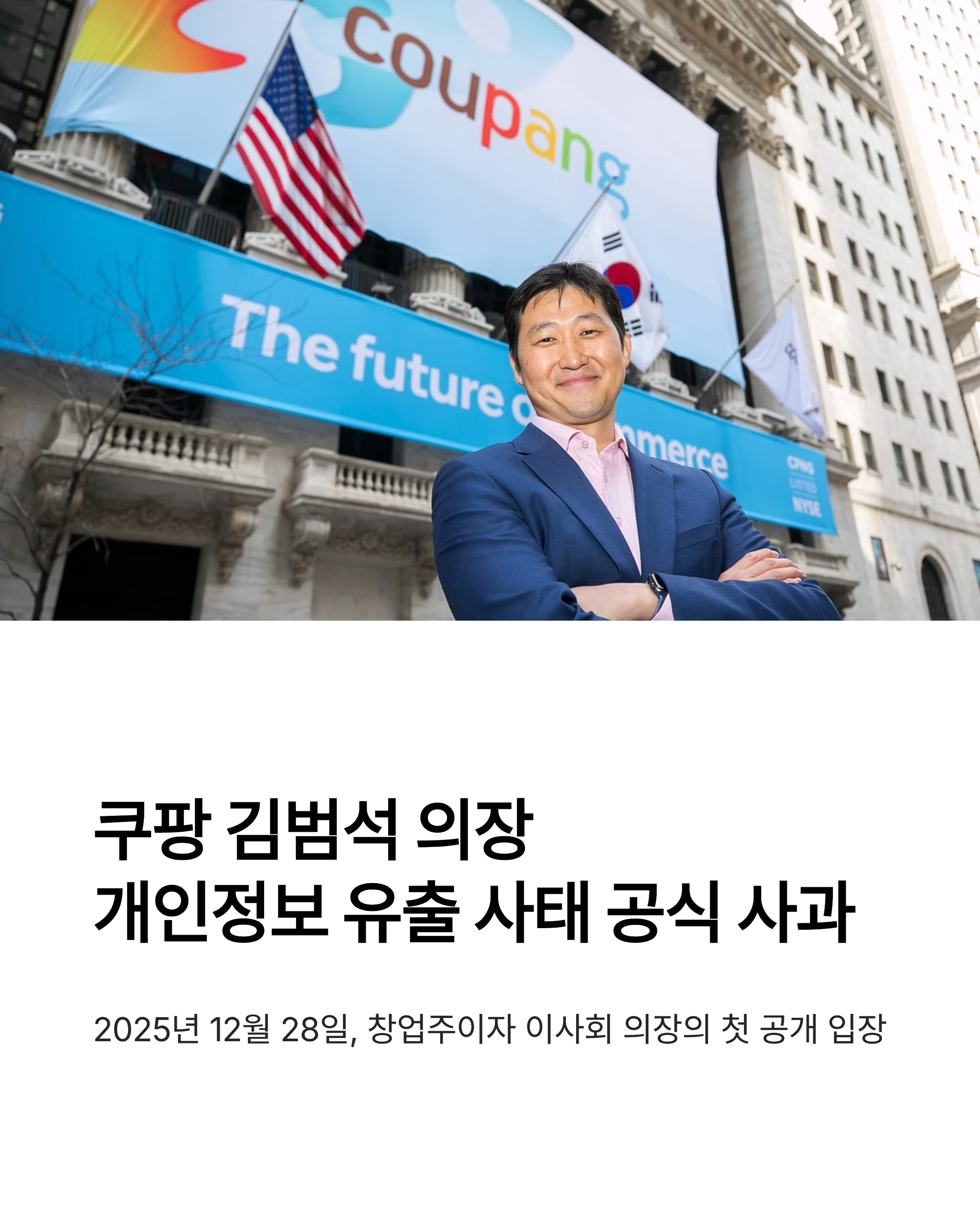 쿠팡 창업주이자 이사회 의장인 김범석 의장이 2025년 12월 28일, 쿠팡에서 발생한 개인정보 유출 사태에 대해 공식 사과문을 냈습니다. 이번 사과는 사고가 알려진 뒤 한동안 “책임 있는 메시지가 없다”는 비판이 이어지던 상황에서 나온 첫 공개 입장이라 더 주목을 받았습니다.