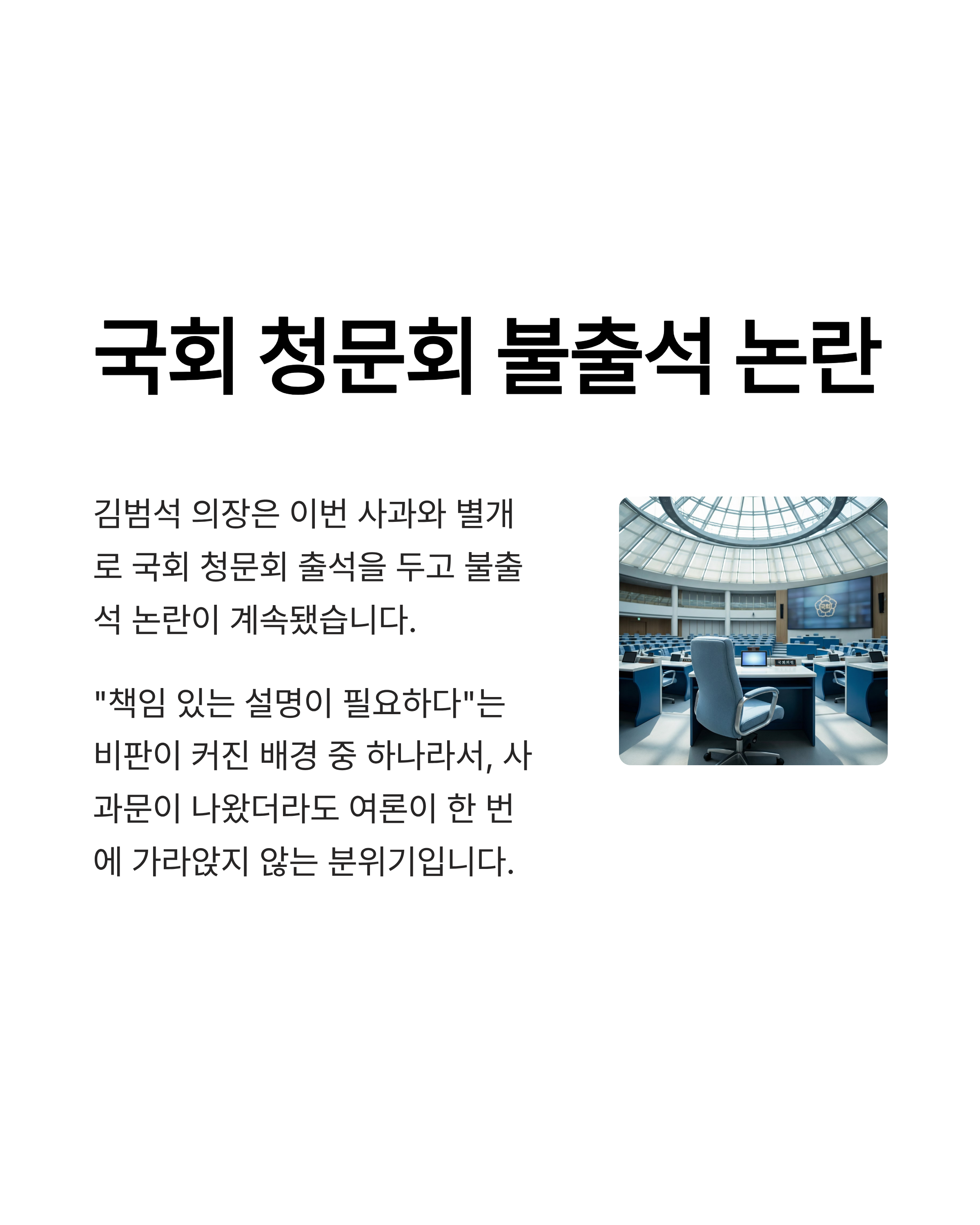 김범석 의장은 이번 사과와 별개로, 국회 청문회 출석을 두고 불출석 논란이 계속됐습니다. “책임 있는 설명이 필요하다”는 비판이 커진 배경 중 하나라서, 사과문이 나왔더라도 여론이 한 번에 가라앉지 않는 분위기입니다.