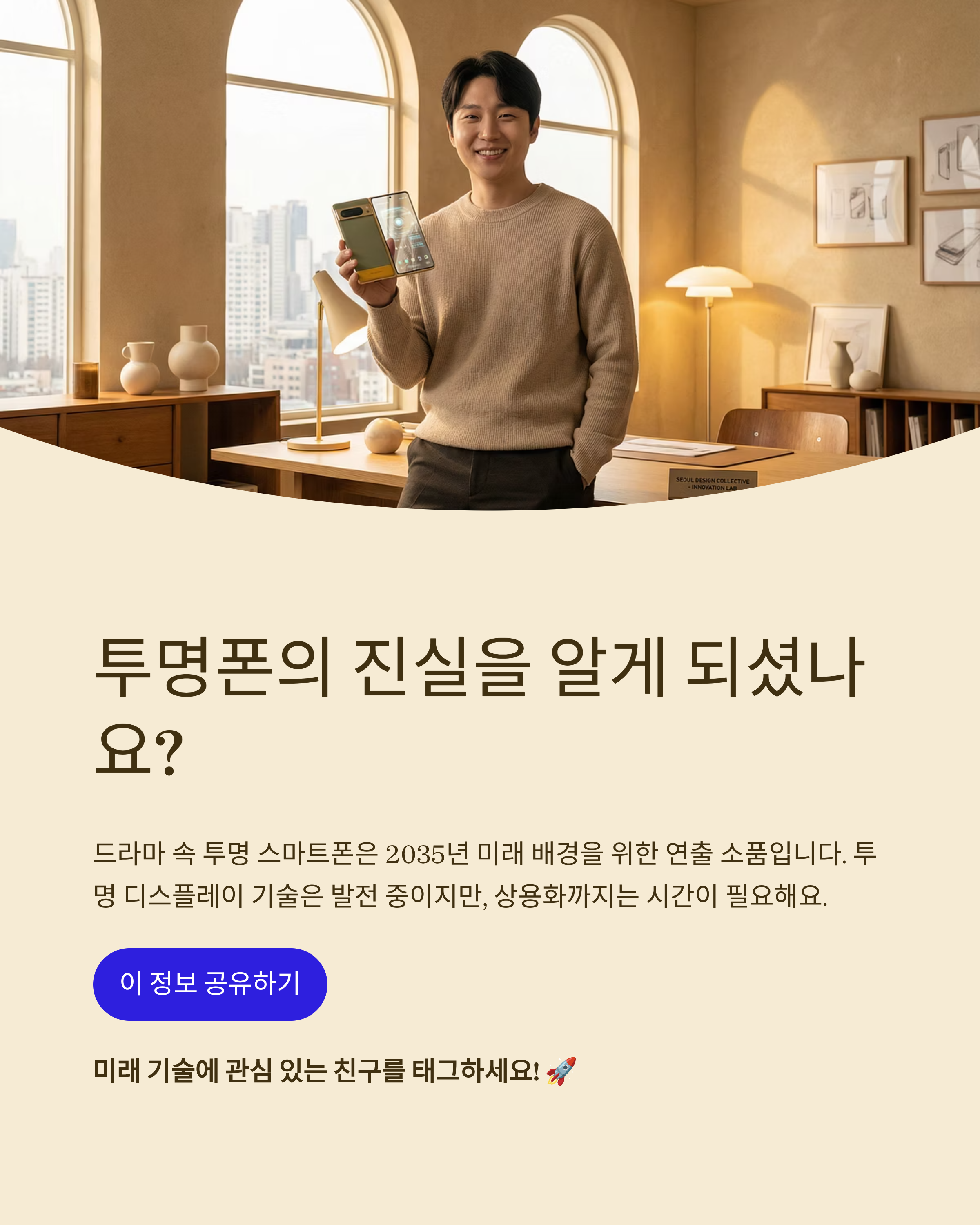 결론부터 말하면, 드라마 속 투명폰은 현재 시중에서 파는 실물 모델로 확인된 제품은 아니고, 연출을 위한 미래(2035년) 분위기 소품/연출 장치로 보는 게 가장 자연스럽습니다.