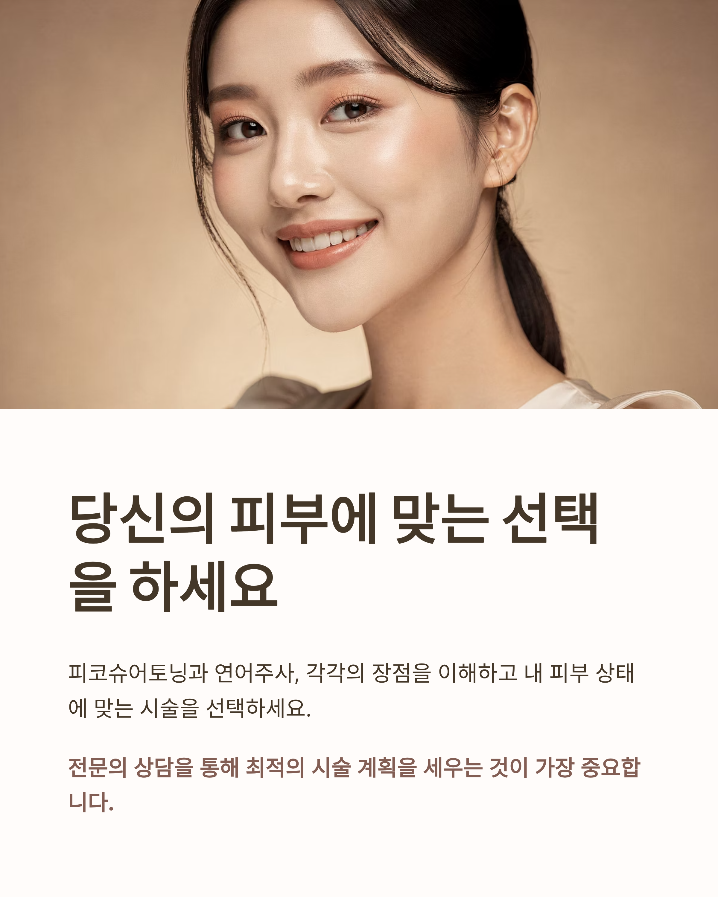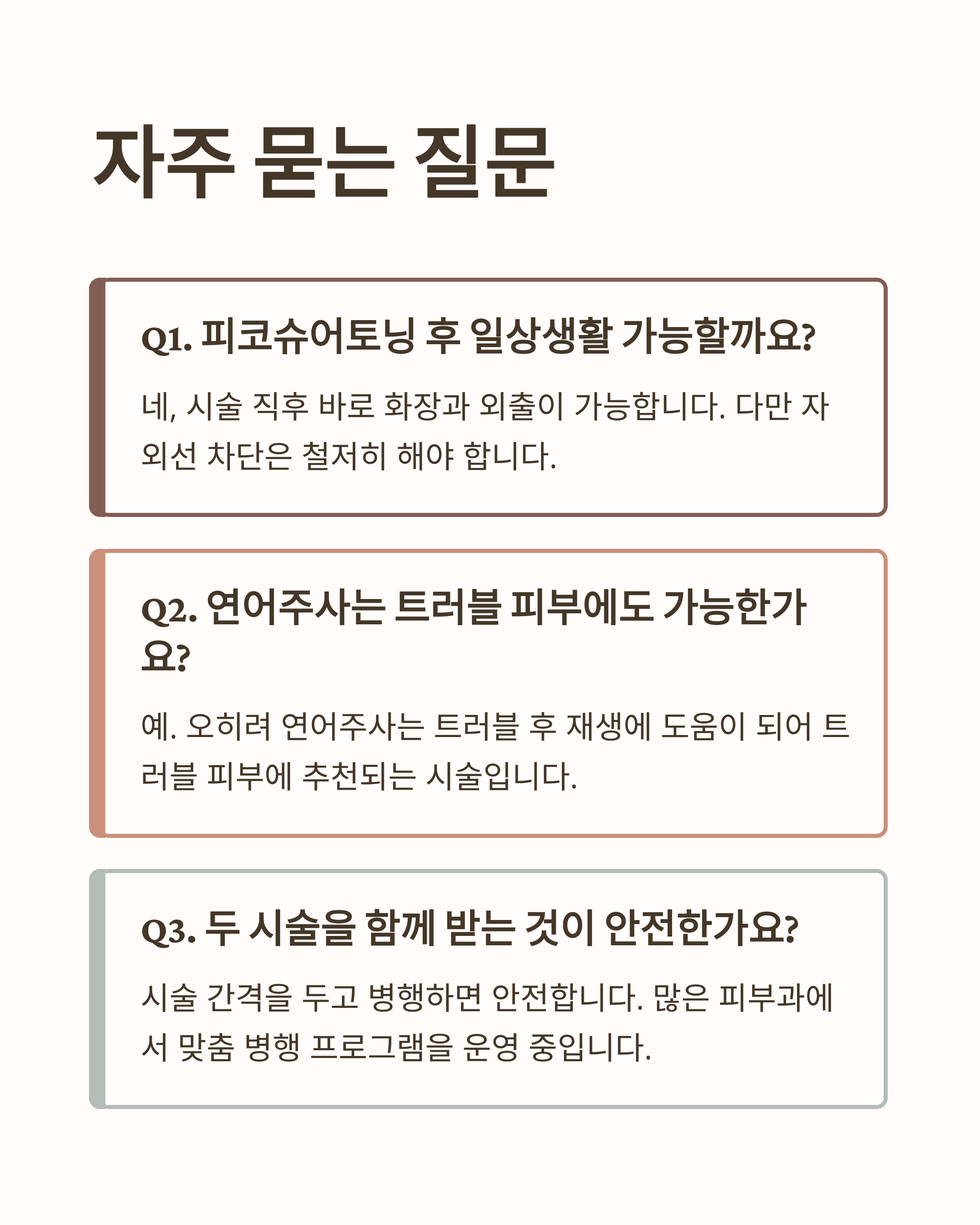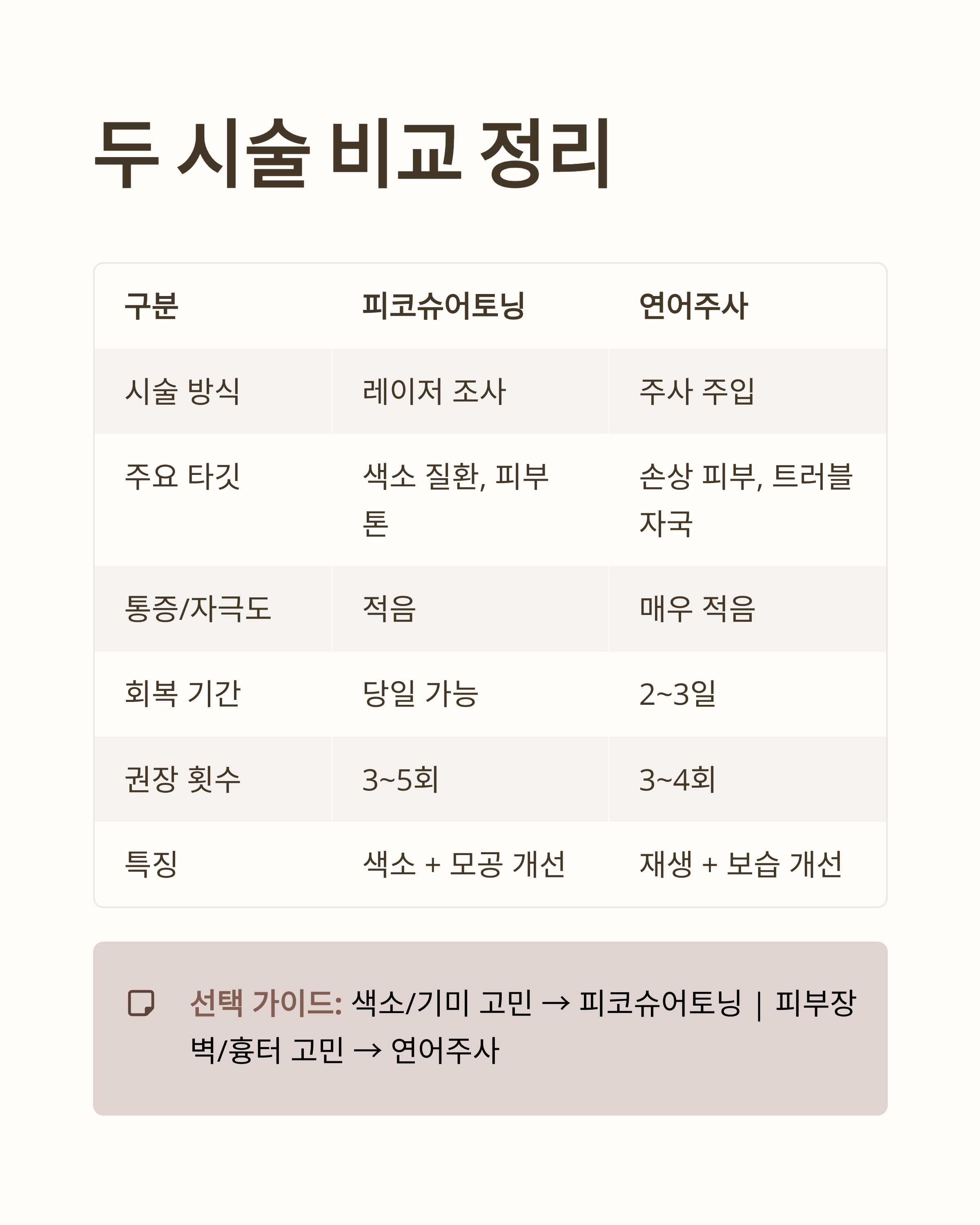 👉 색소/기미 → 피코슈어토닝, 피부장벽/흉터 → 연어주사가 적합합니다.
