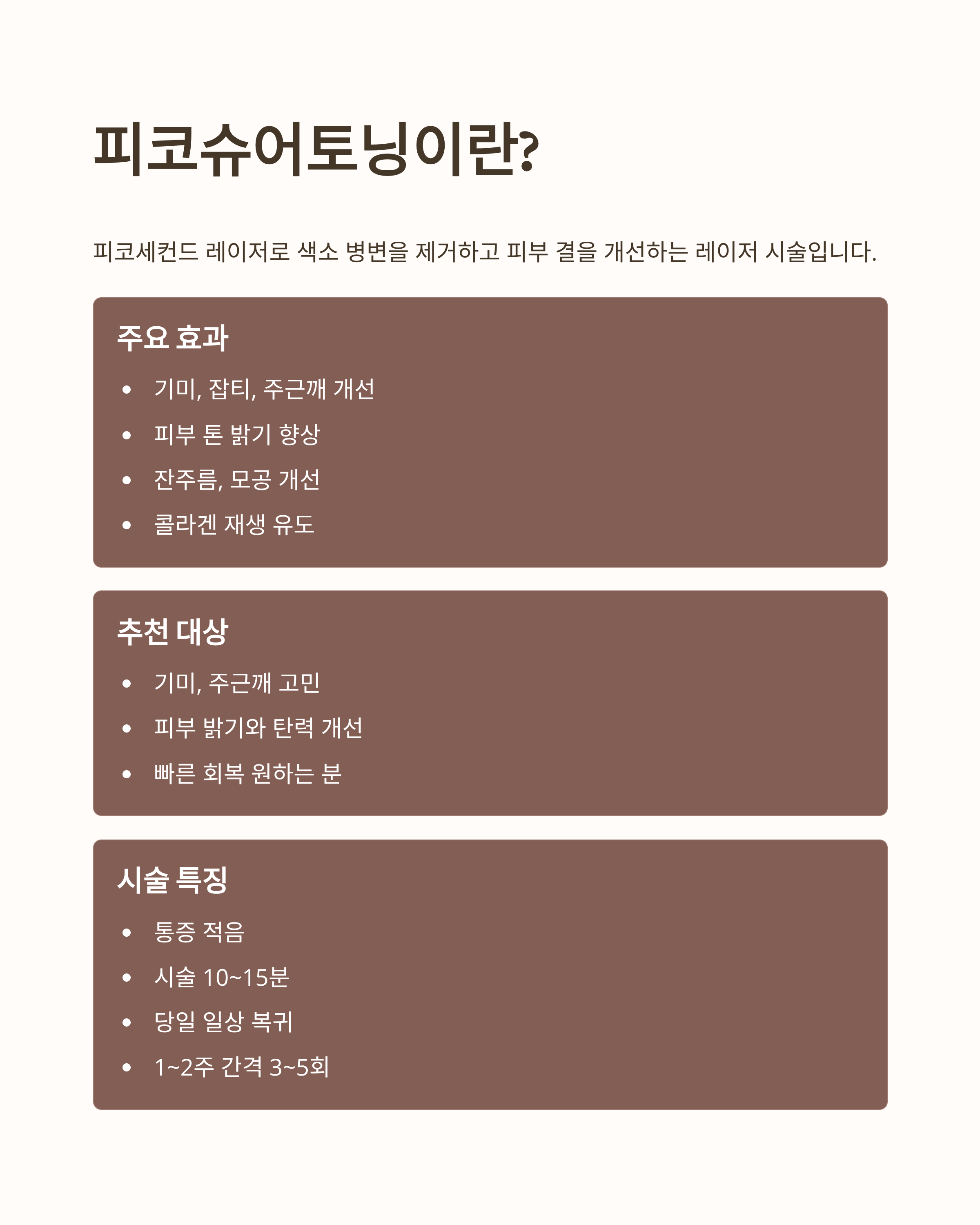 피코슈어토닝은 피코세컨드 레이저 장비를 활용해 색소 병변을 제거하고 피부 결을 개선하는 레이저 시술입니다.