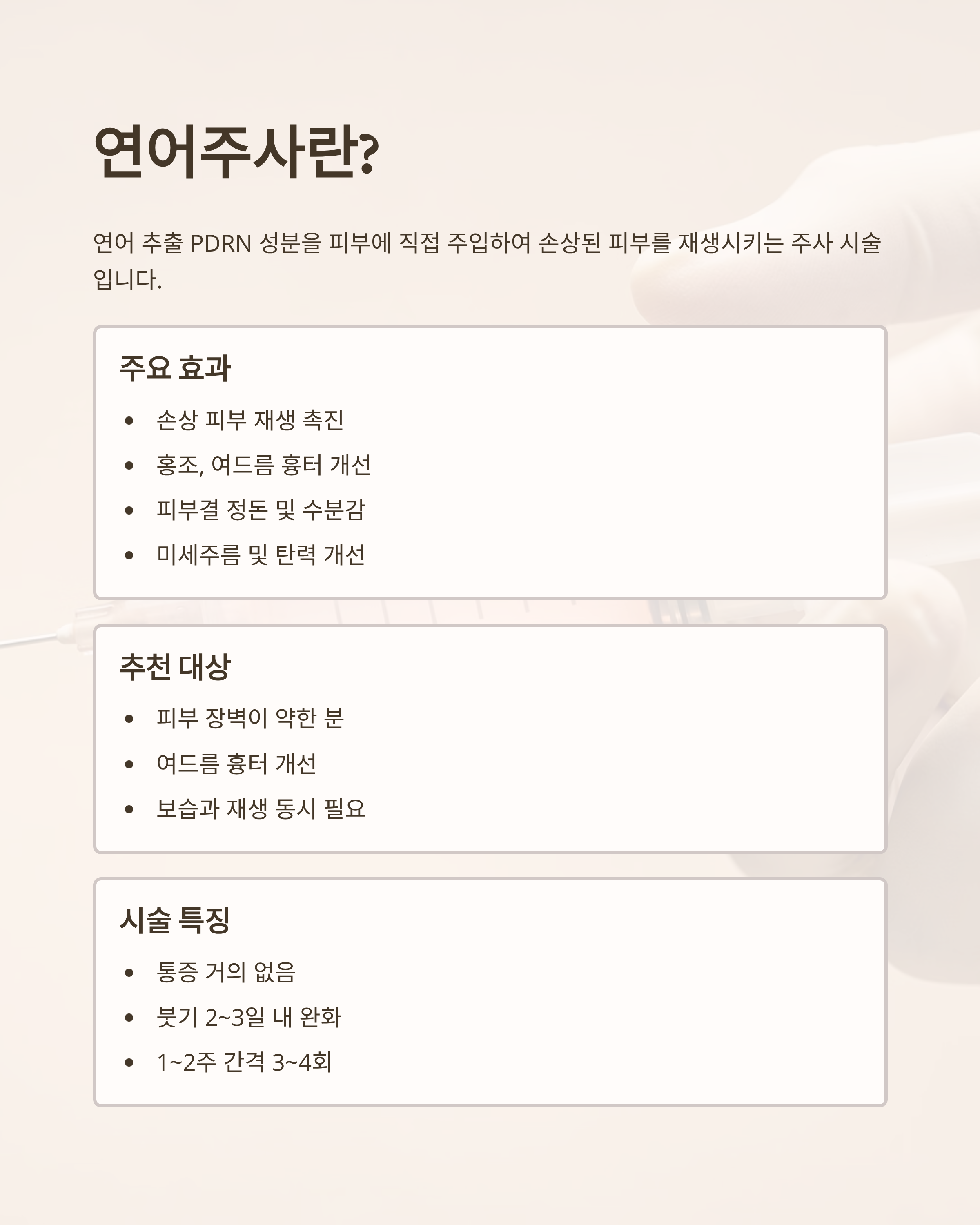 연어주사는 연어에서 추출한 PDRN(폴리디옥시리보뉴클레오타이드) 성분을 피부에 직접 주입하는 주사 시술입니다.