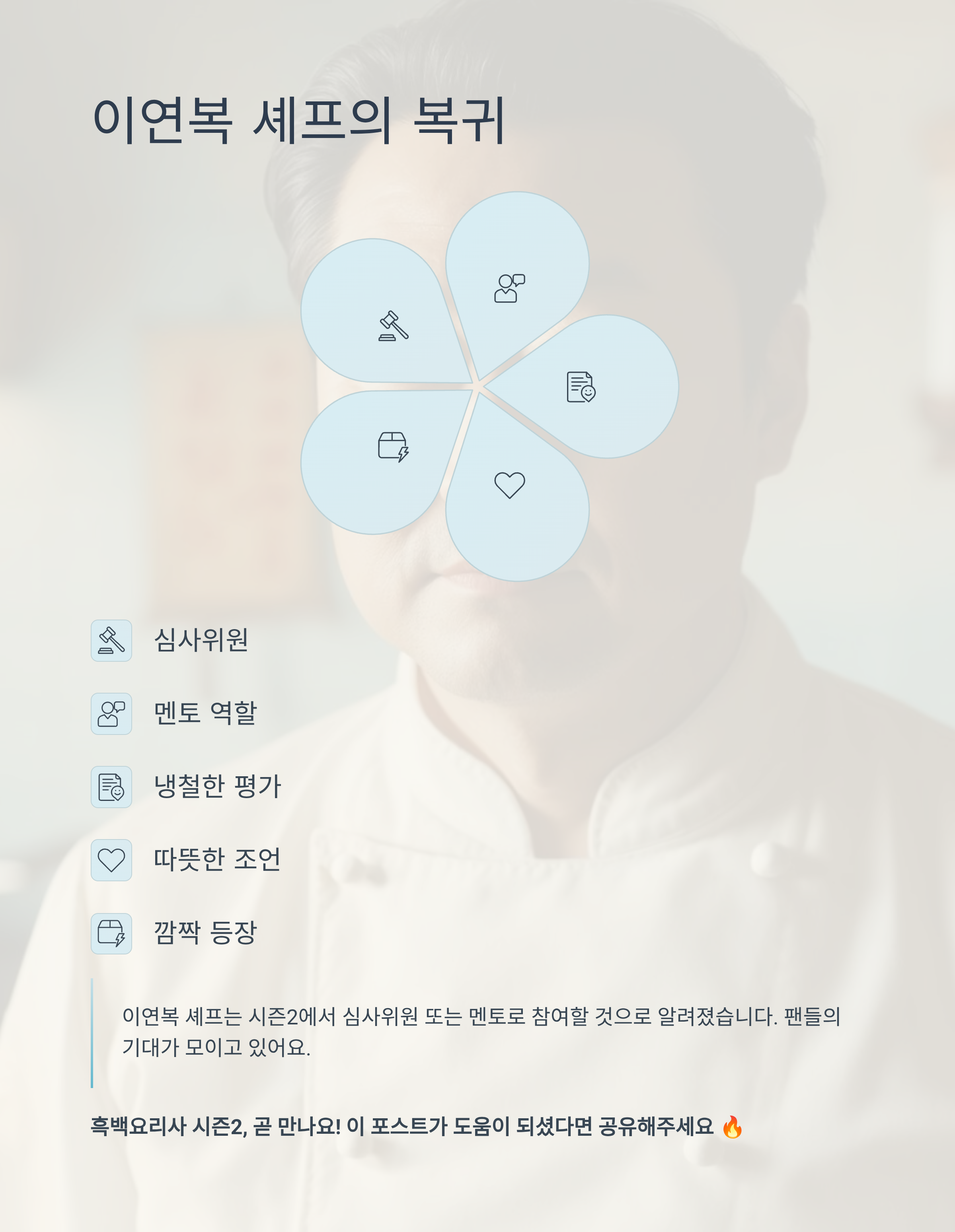 이연복 셰프는 시즌2에서 심사위원 또는 멘토로 참여할 것으로 알려졌습니다. 그가 보여줄 냉철한 평가와 따뜻한 조언, 그리고 미션 속 깜짝 등장까지 팬들의 기대가 모이고 있어요.