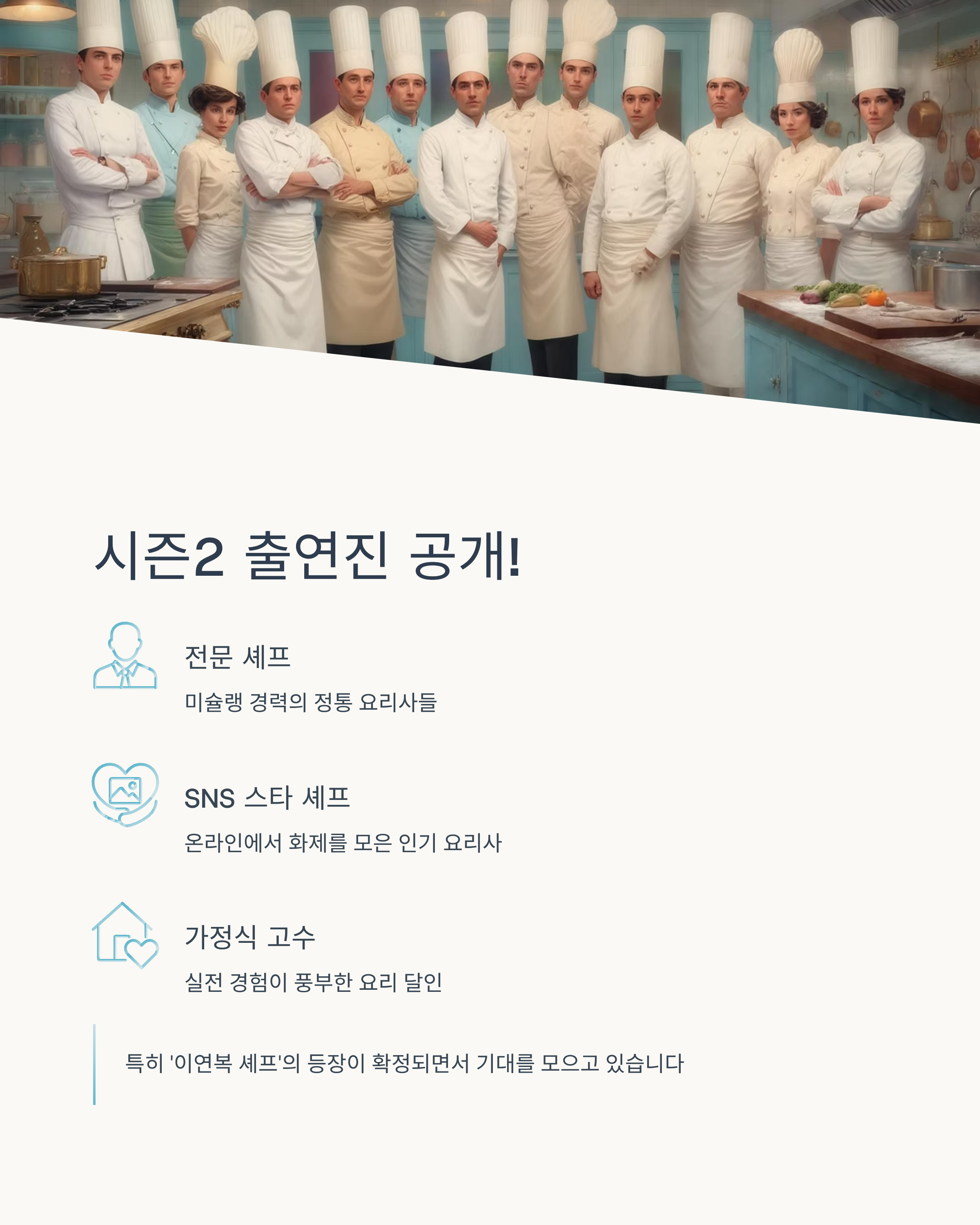 이번 시즌의 출연진은 전문 셰프, SNS 스타 셰프, 가정식 요리 고수 등 다양한 배경의 인물들로 구성되어 있어요. 기존 방송 경력이 있는 유명 셰프들도 포함되어 있으며, 특히 '이연복 셰프'의 등장이 확정되면서 기대를 모으고 있습니다.