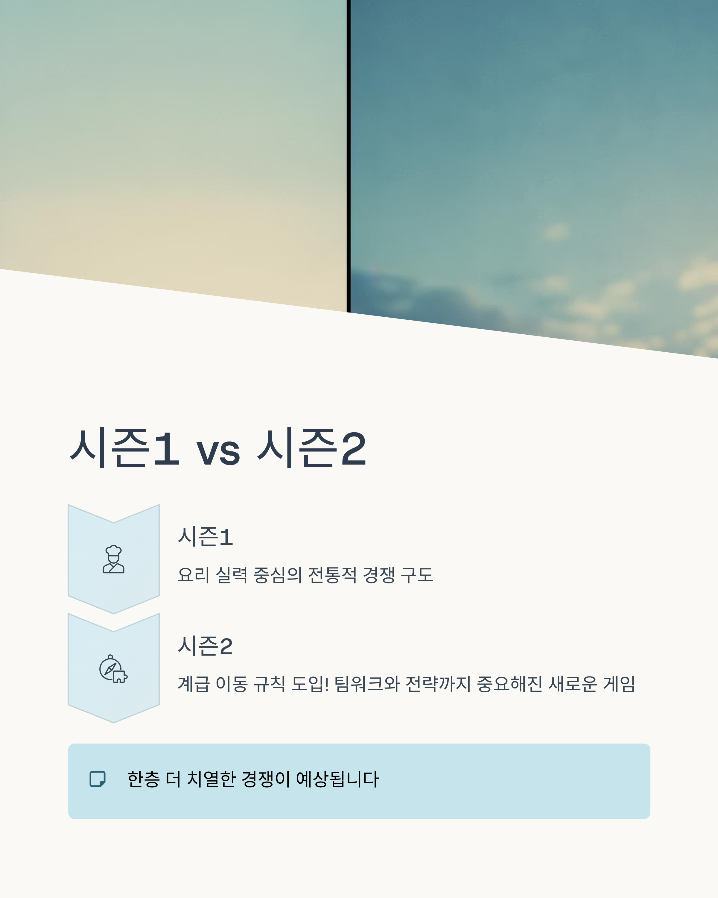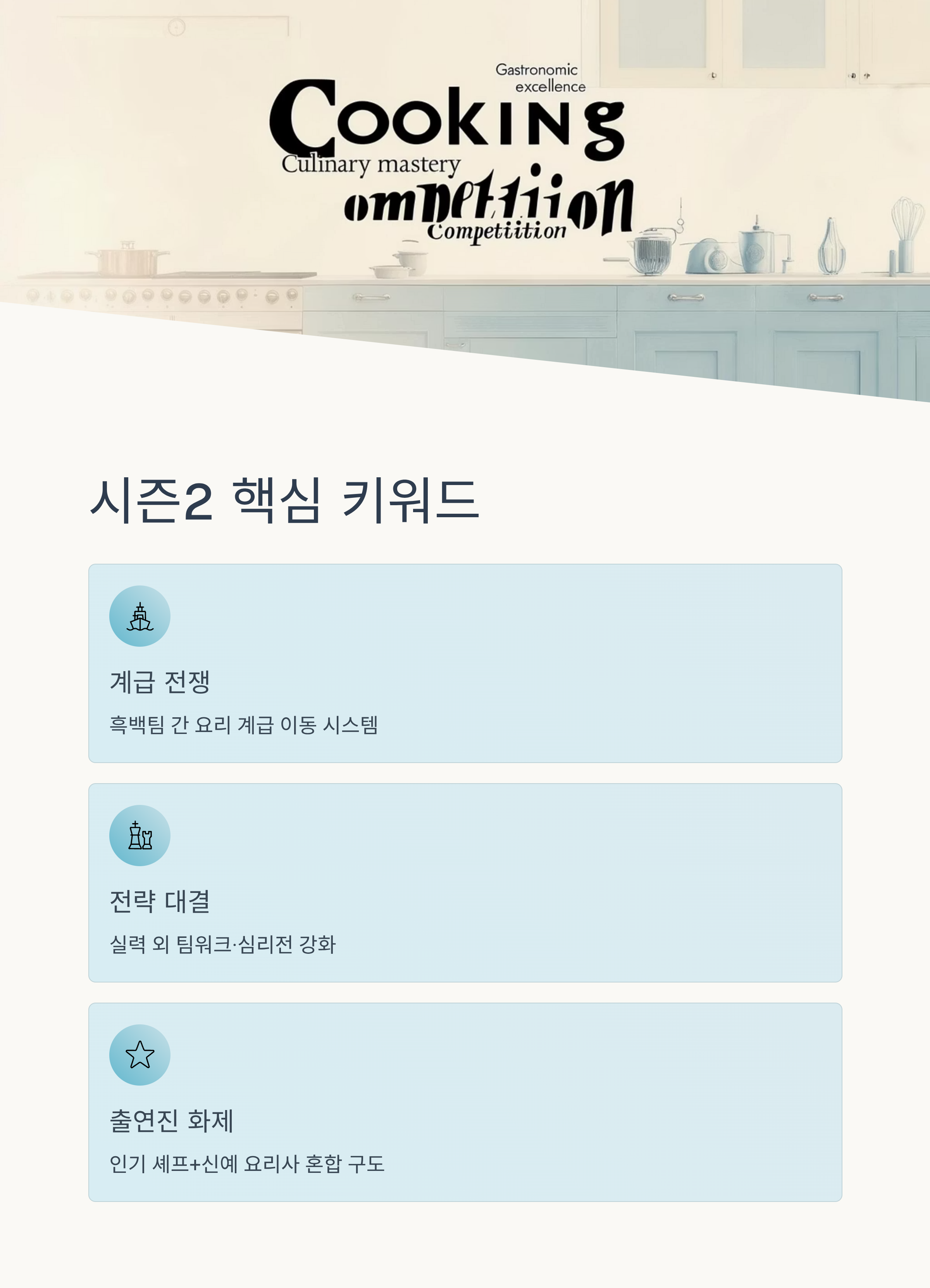 기존 시즌1이 요리 실력 중심의 전통적 경쟁 구도였다면, 시즌2는 요리 실력에 더해 ‘계급 이동’이라는 새로운 규칙이 도입됩니다. 즉, 요리 실력뿐 아니라 팀워크와 전략까지 중요해진 거죠. 한층 더 치열한 경쟁이 예상됩니다.