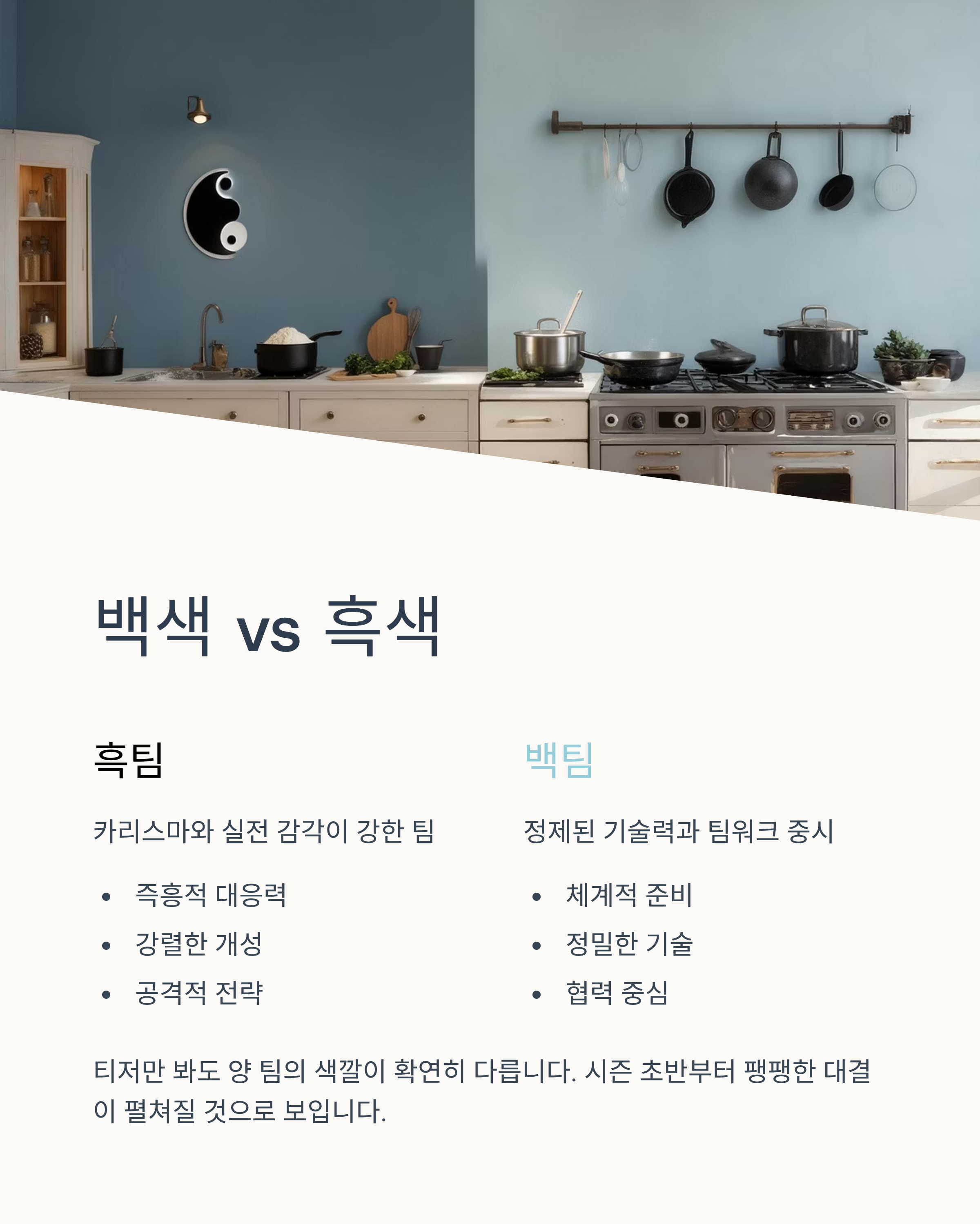티저만 봐도 양 팀의 색깔이 확연히 다릅니다. 흑팀은 카리스마와 실전 감각이 강한 반면, 백팀은 정제된 기술력과 팀워크를 중시하는 듯한 분위기예요. 시즌 초반부터 팽팽한 대결이 펼쳐질 것으로 보입니다.