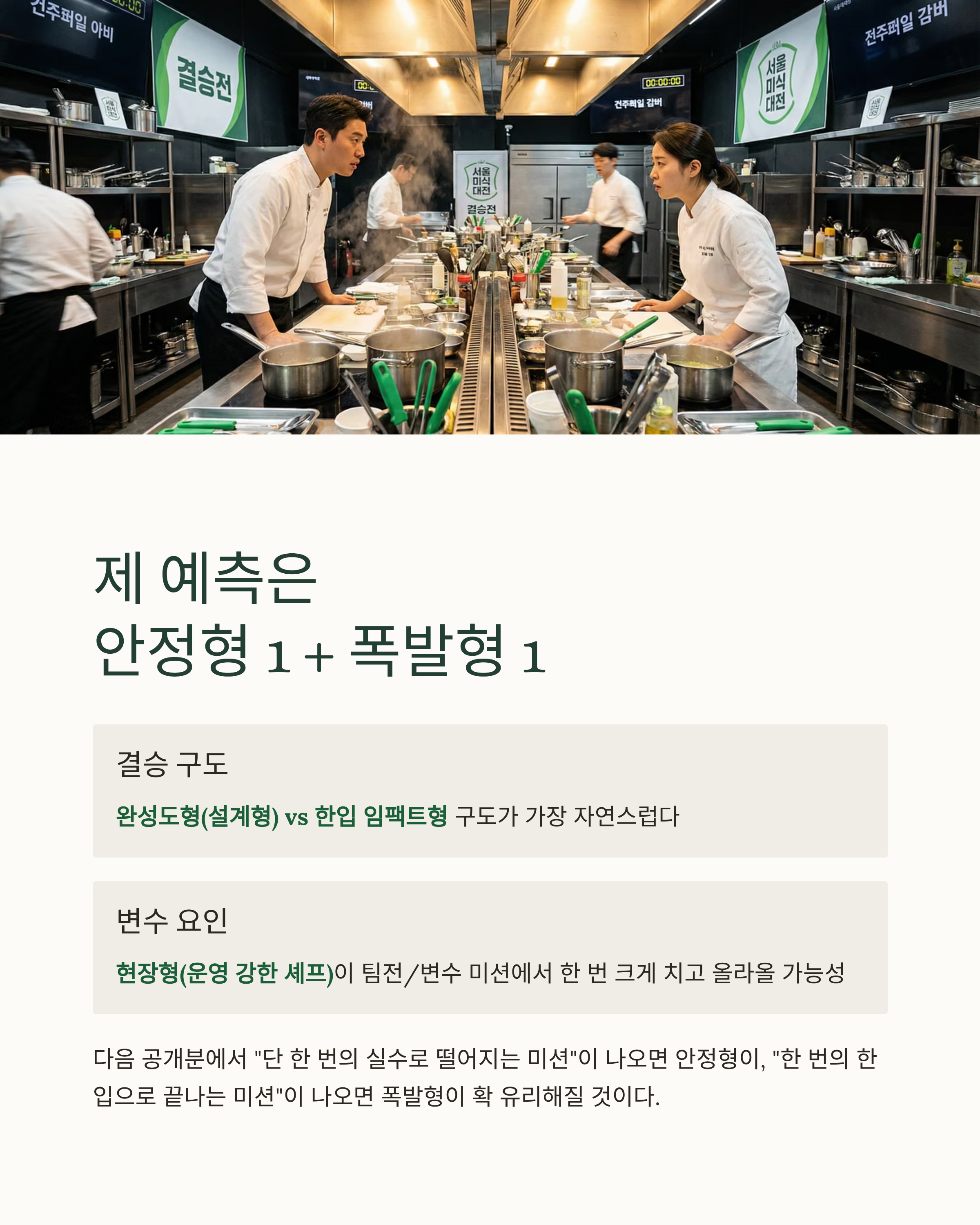 - 결승은 ‘완성도형(설계형)’ vs ‘한입 임팩트형’ 구도가 가장 자연스럽고,
