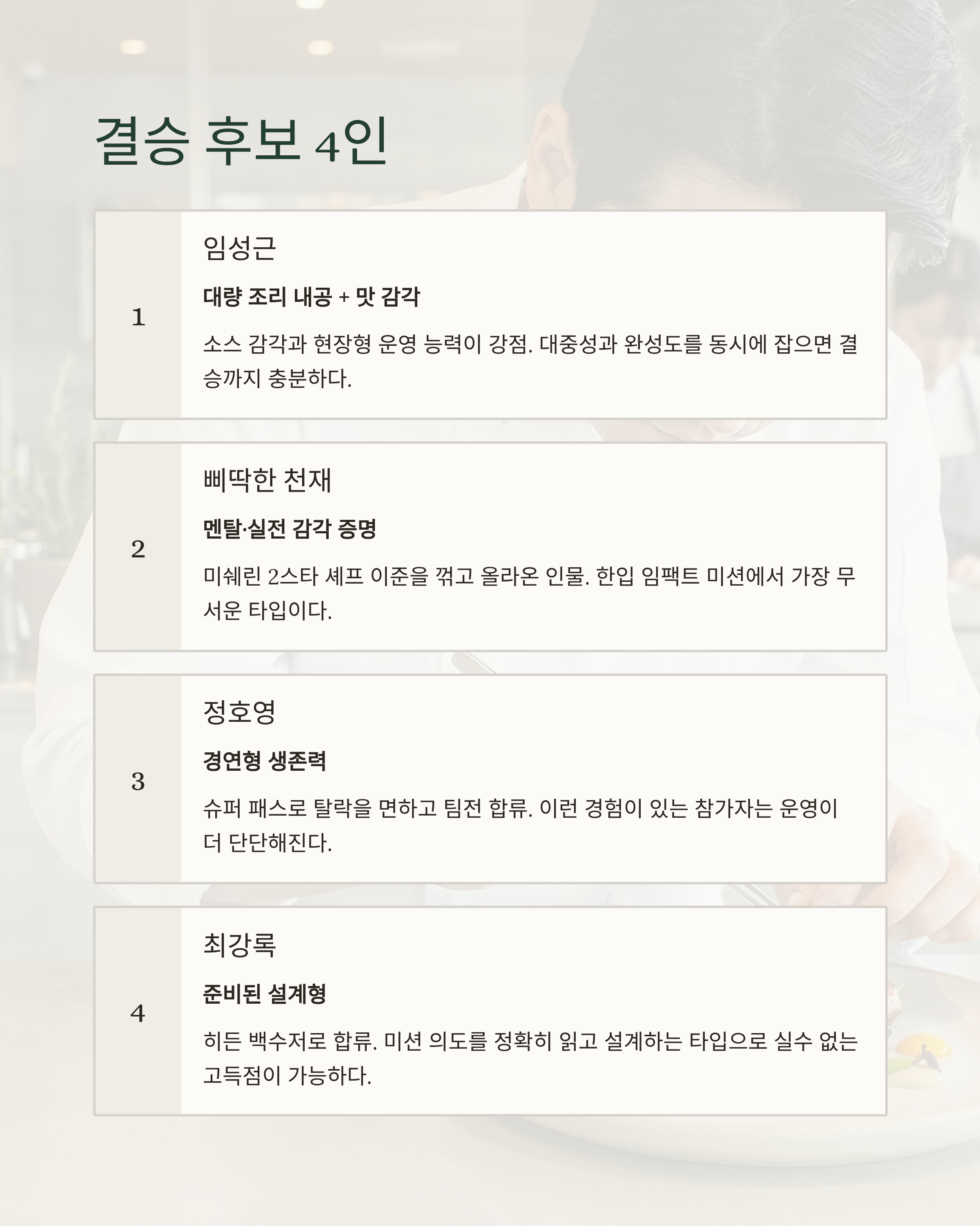 4) 최강록(히든 백수저) — 준비된 설계형, 완성도로 끝까지 간다