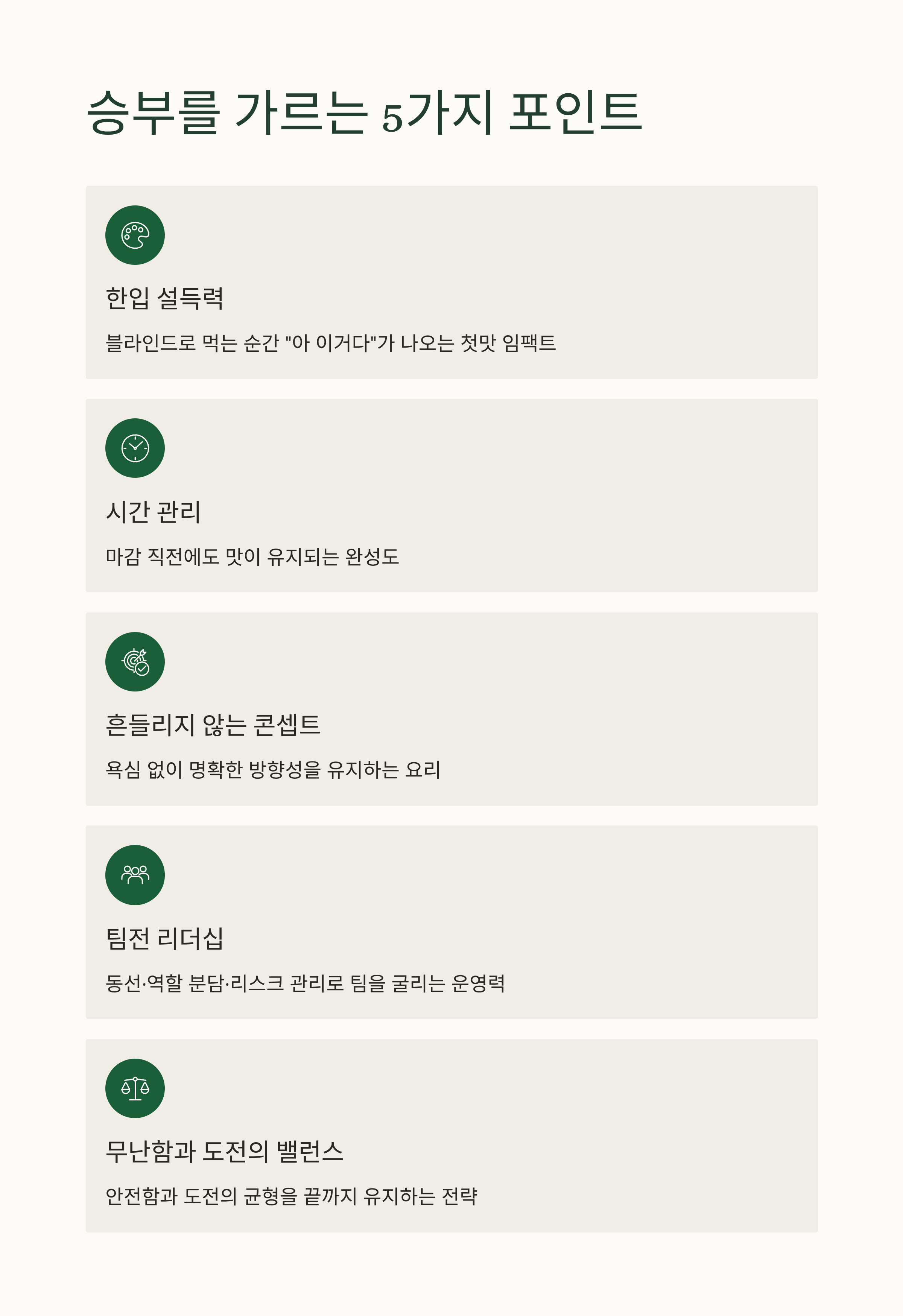 블라인드로 먹는 순간, 설명 없이도 “아 이거다”가 나오는 요리가 강합니다. ‘맛의 방향’이 명확해야 해요.