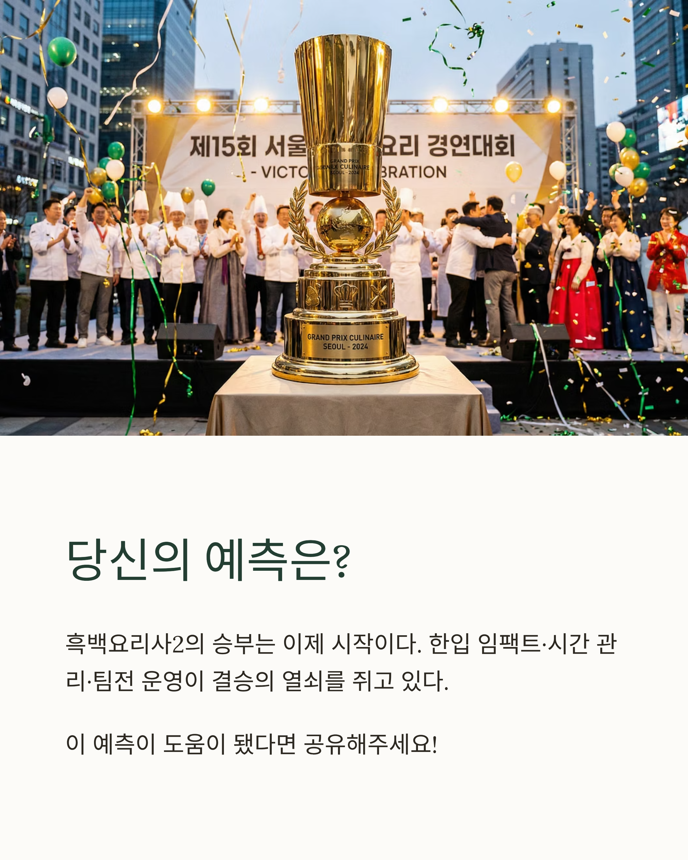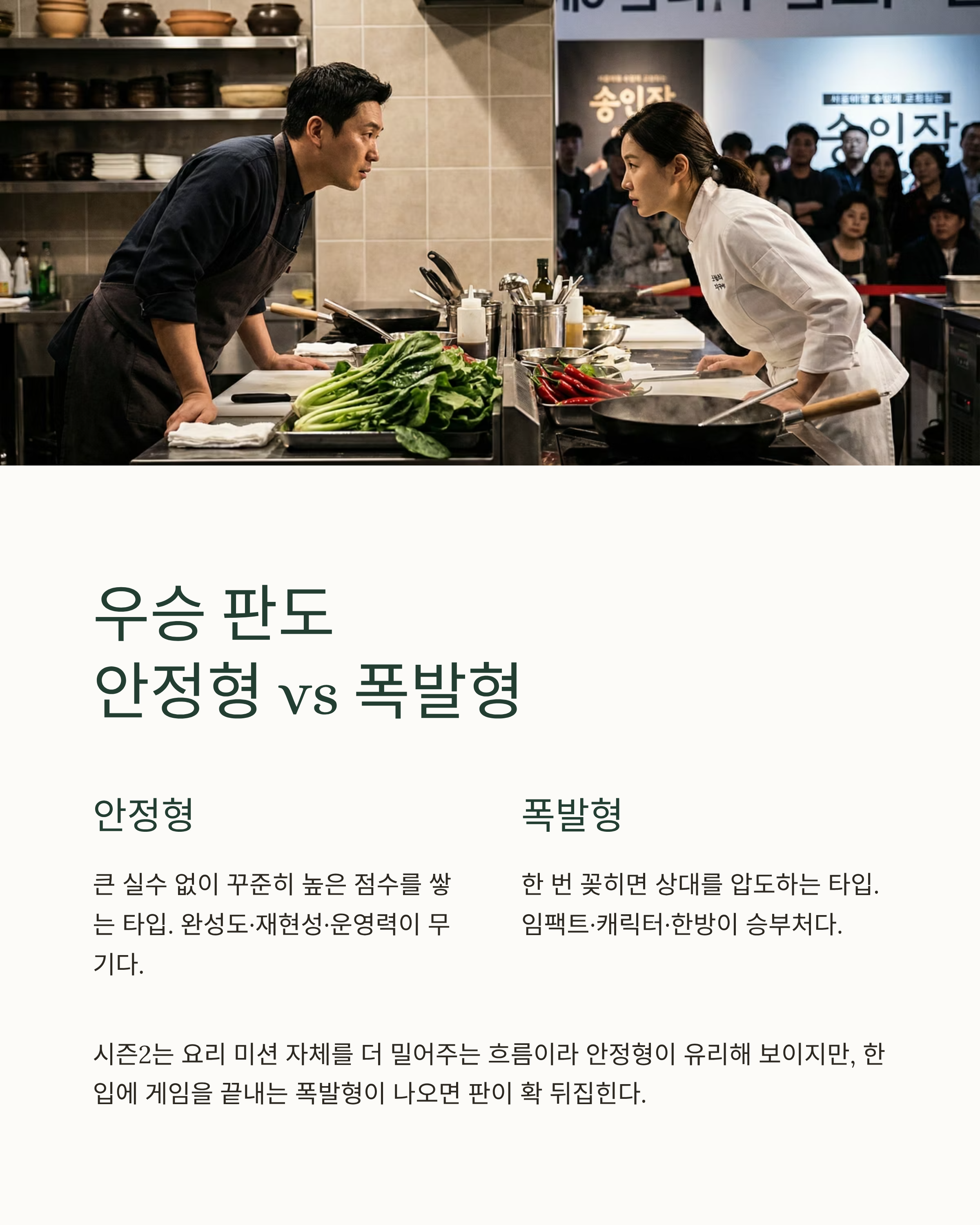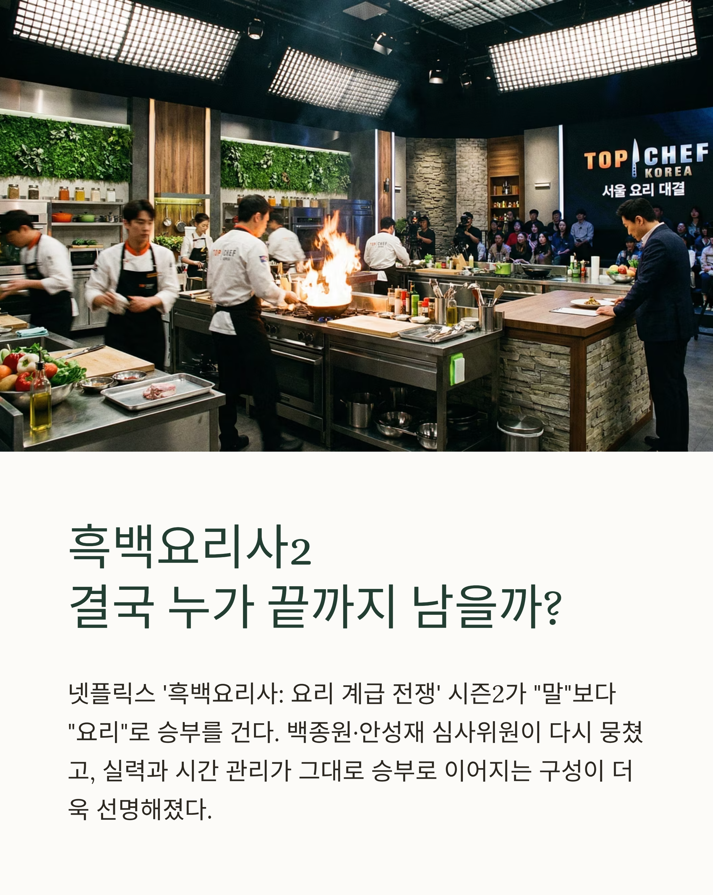 메타 설명 : 흑백요리사2 대결 흐름을 바탕으로 승부 포인트(한입 임팩트·시간 관리·팀전 운영)를 정리하고, 임성근·삐딱한 천재·정호영·최강록을 중심으로 결승 구도와 결과 시나리오를 예측했습니다.