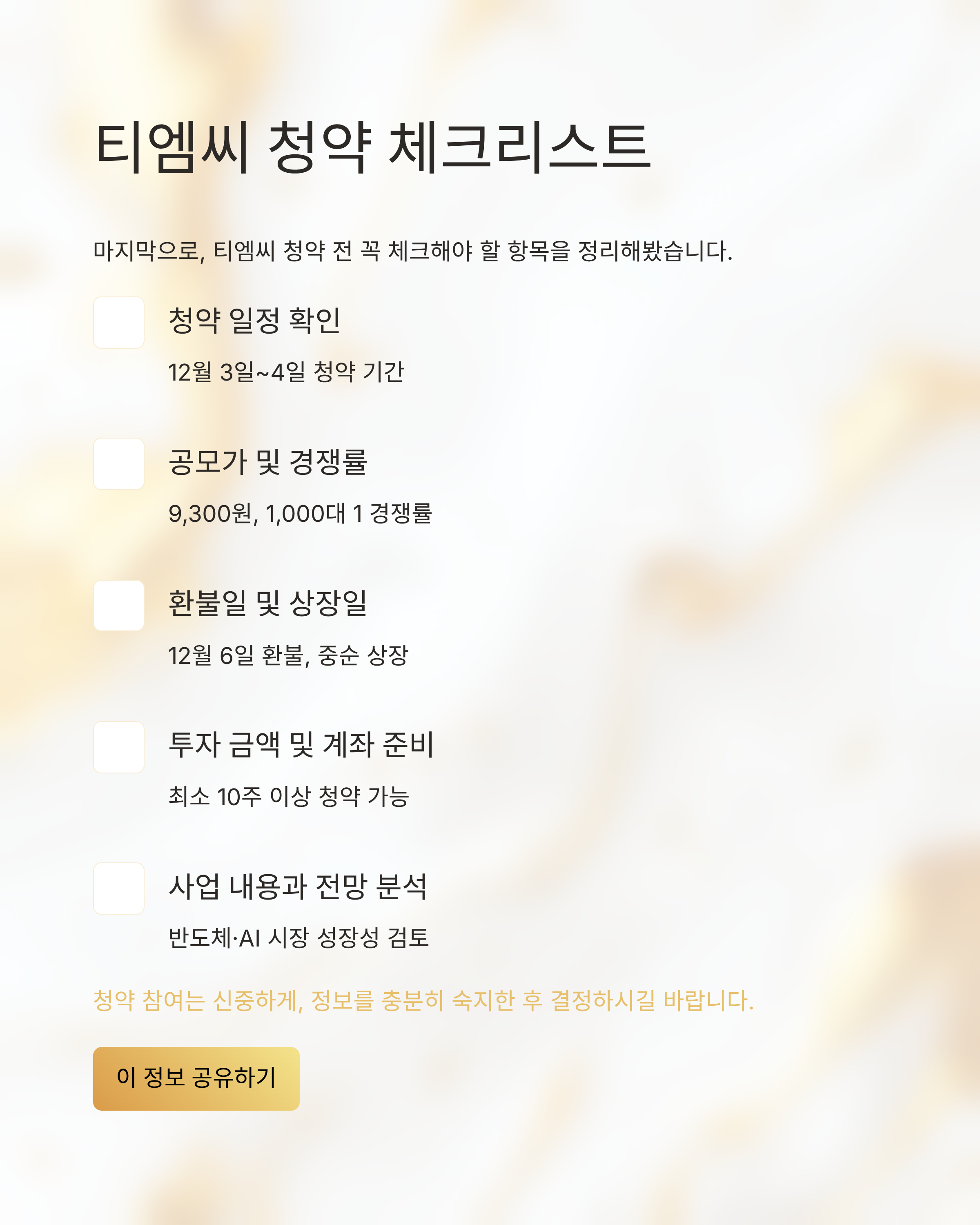 마지막으로, 티엠씨 청약 전 꼭 체크해야 할 항목을 정리해봤습니다.