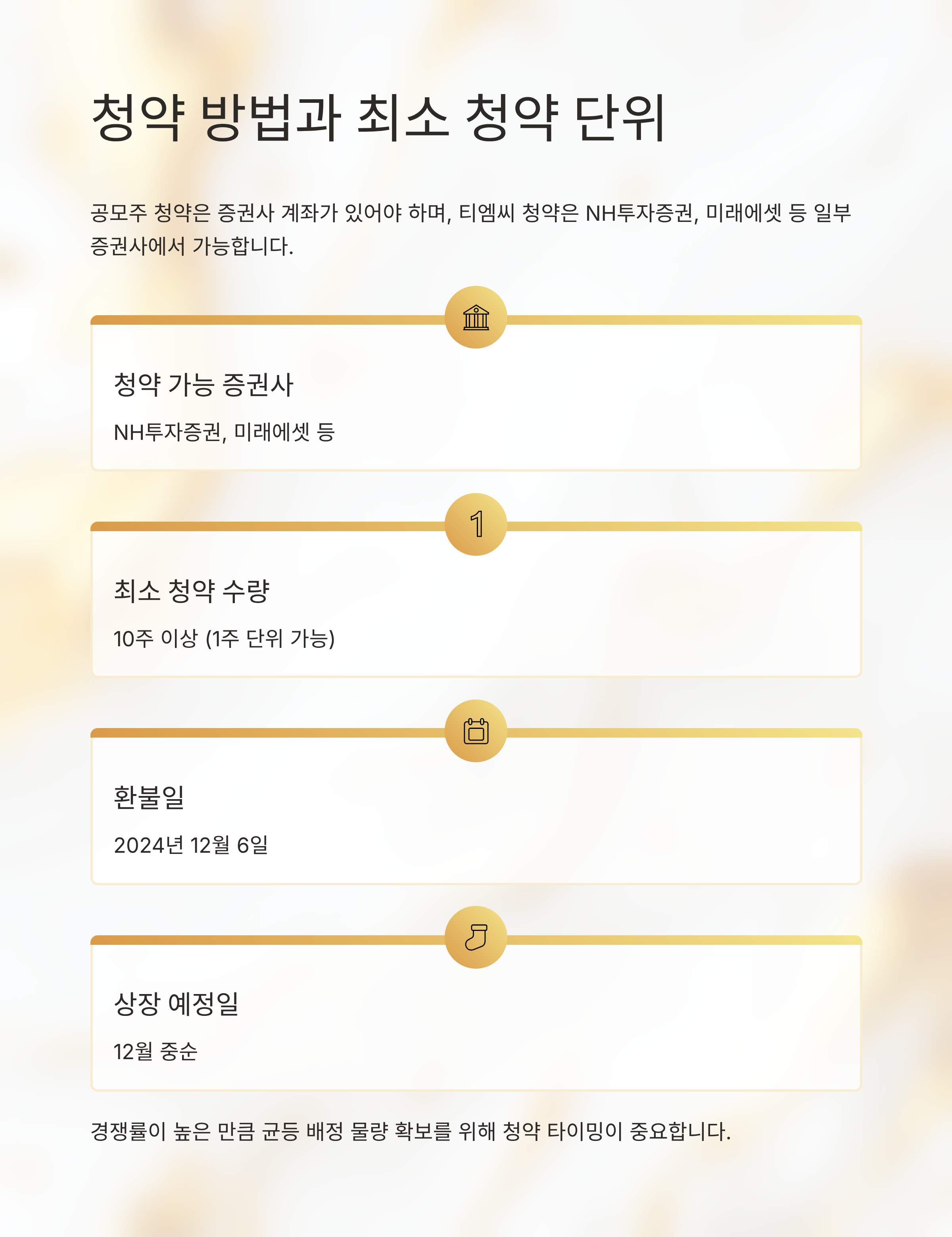 청약은 1주 단위로 가능하며, 최소 청약 수량은 10주입니다. 경쟁률이 높은 만큼 균등 배정 물량 확보를 위해 청약 타이밍이 중요합니다.