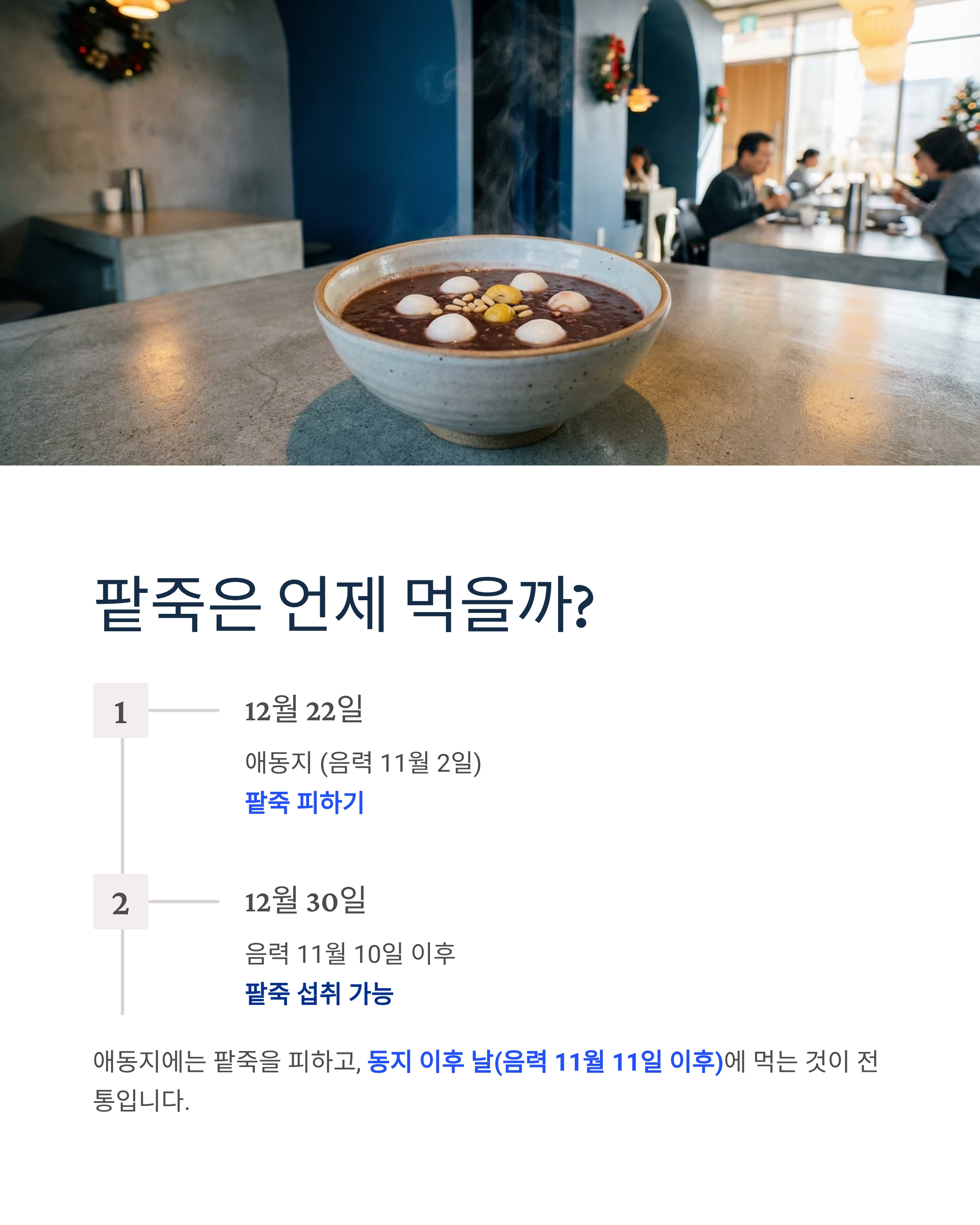 2025년 12월 22일은 애동지(애기동지)로, 전통적으로 팥죽을 먹지 않는 날이다. 애동지의 정확한 의미, 팥죽을 피해야 하는 이유, 대체 음식과 전통 풍습을 깔끔하게 정리한 블로그 글.