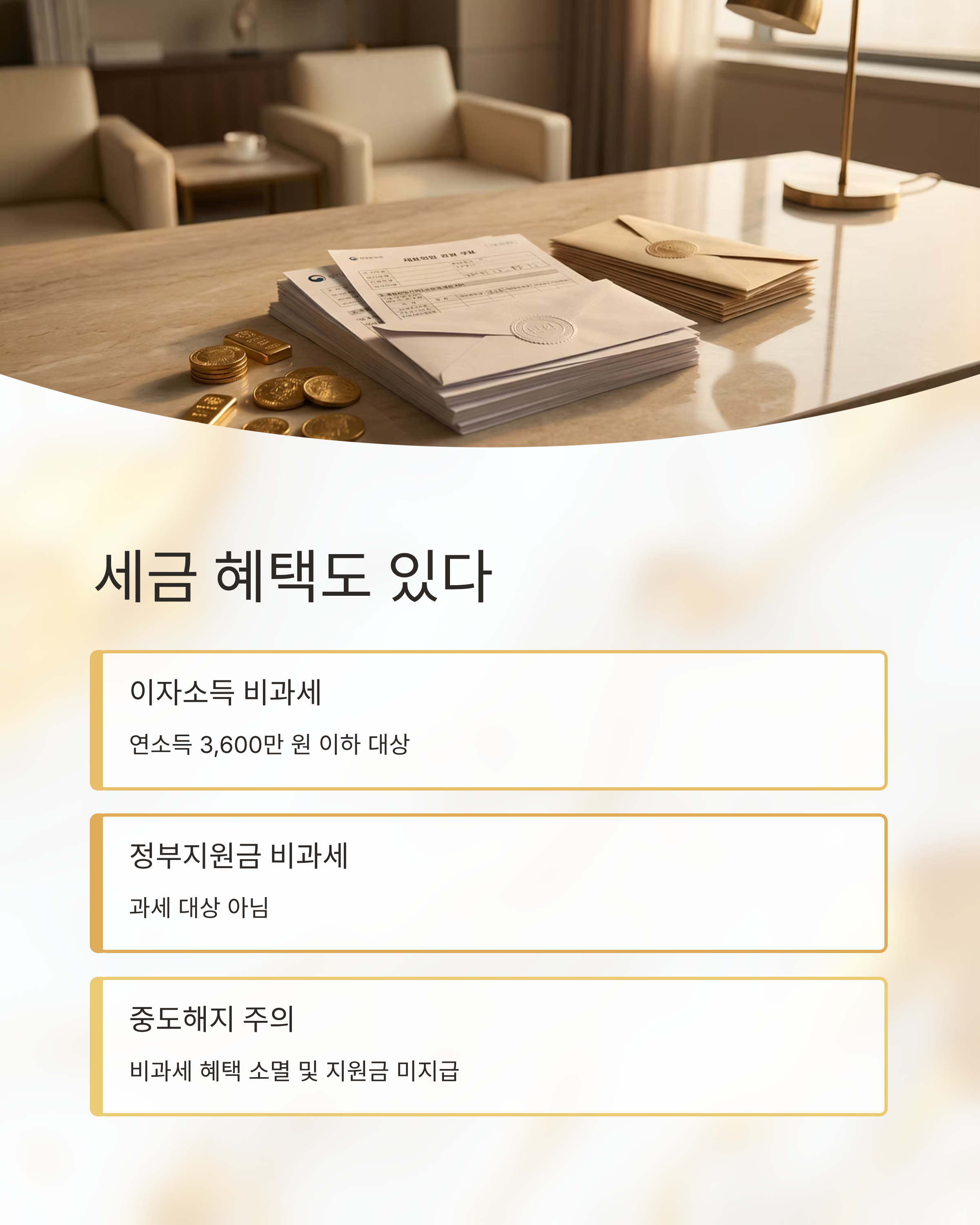 - 이자소득 비과세 혜택: 연소득 3,600만 원 이하 대상