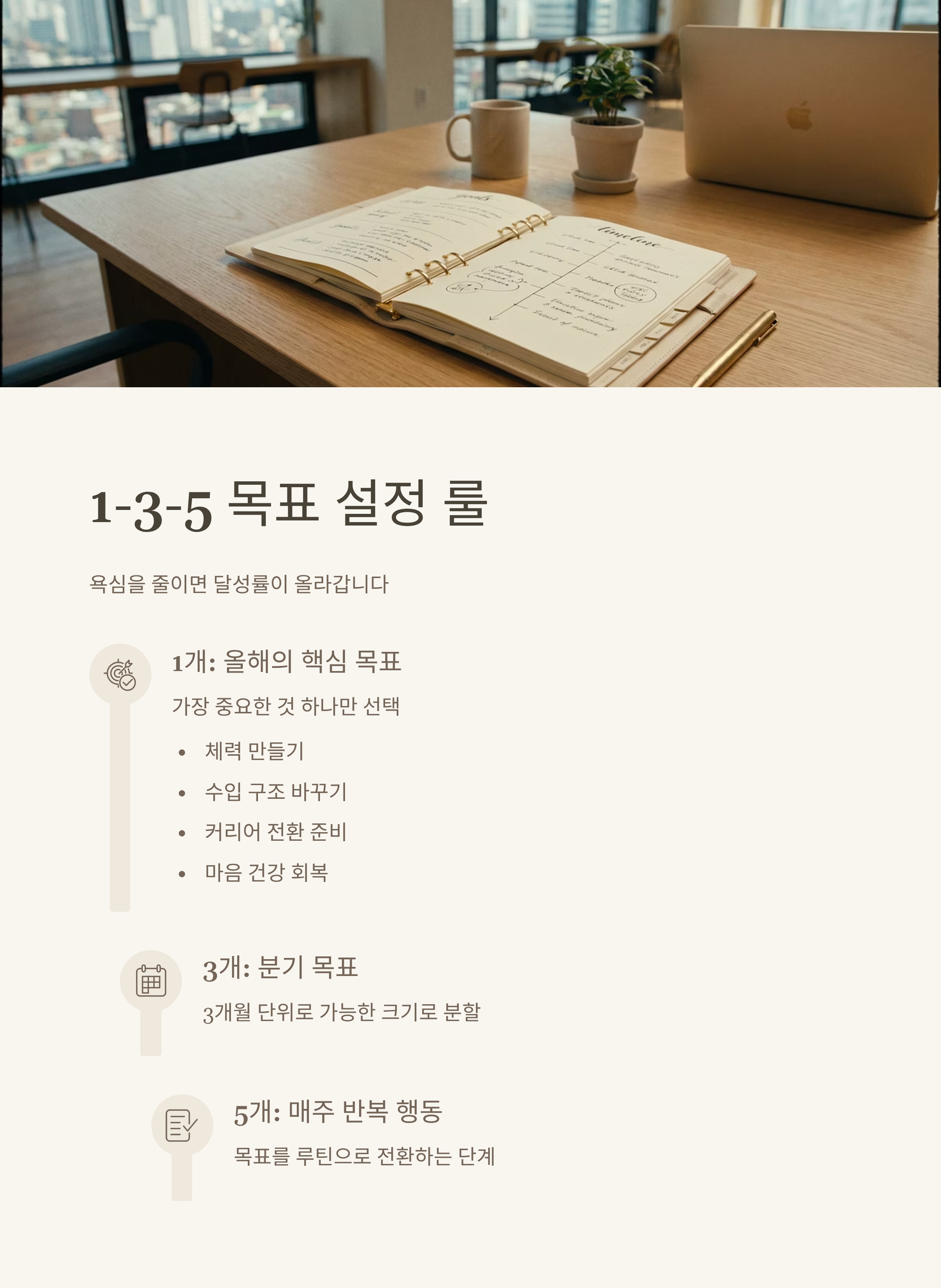 메타 설명: 2026년 새해 목표를 현실적으로 세우고 끝까지 실천하는 방법을 정리했습니다. 목표가 무너지는 이유부터 1-3-5 목표 설정법, 목표를 행동으로 바꾸는 공식, 작심삼일을 막는 실천 팁과 분야별 예시까지 한눈에 확인하세요.