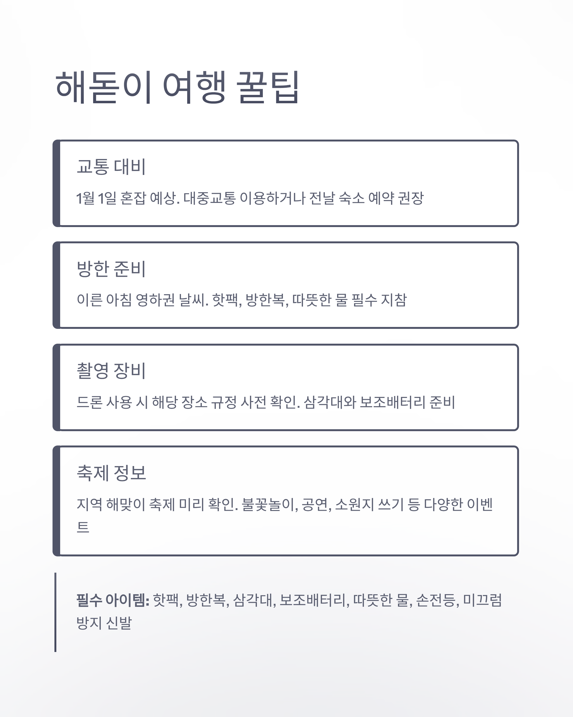 - 지역 해맞이 축제 정보 미리 확인 → 불꽃놀이, 공연, 소원지 쓰기 등 다양한 이벤트 존재