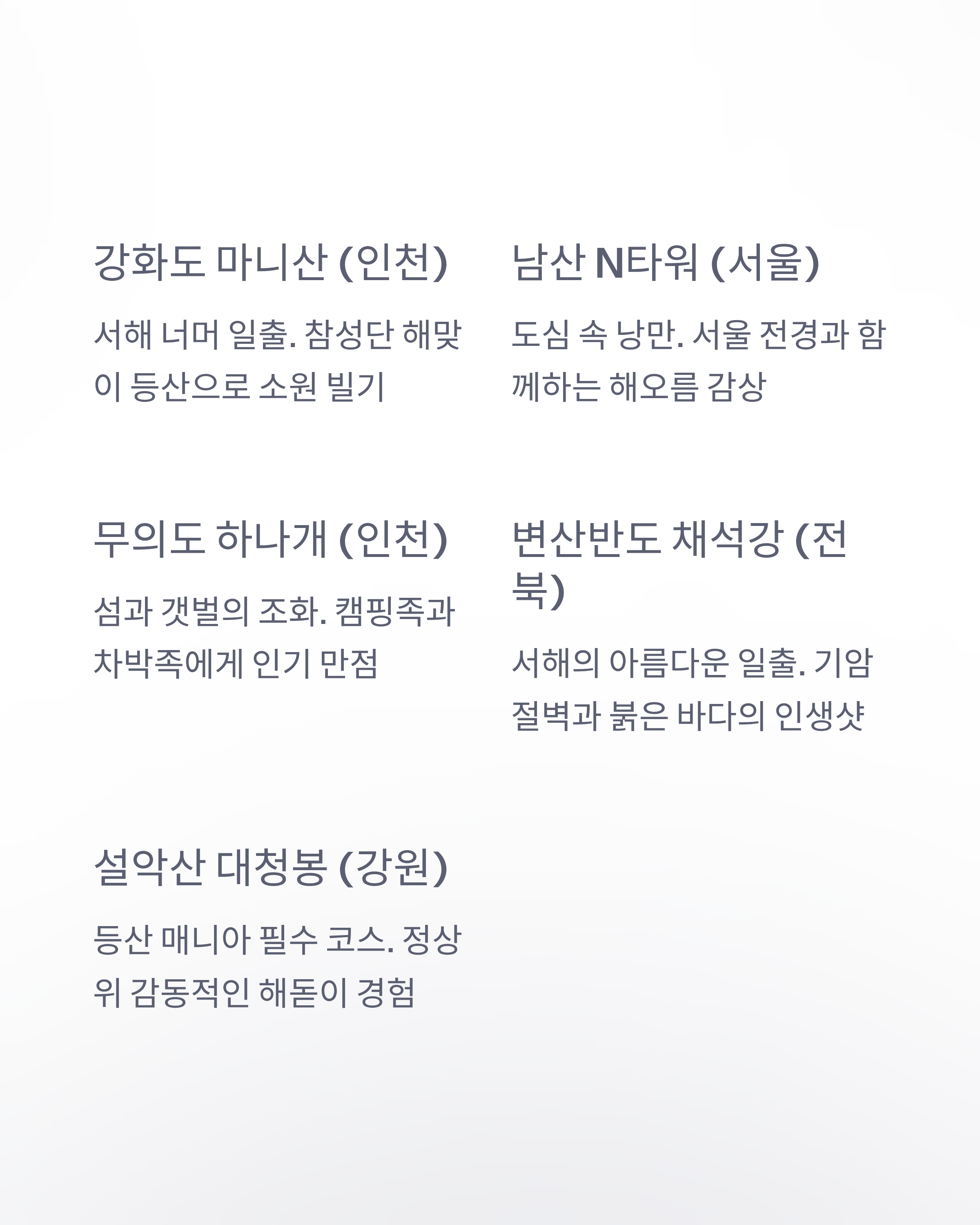 - 방한 준비 철저하게 → 해돋이는 대부분 이른 아침, 영하권 날씨 대비 필요