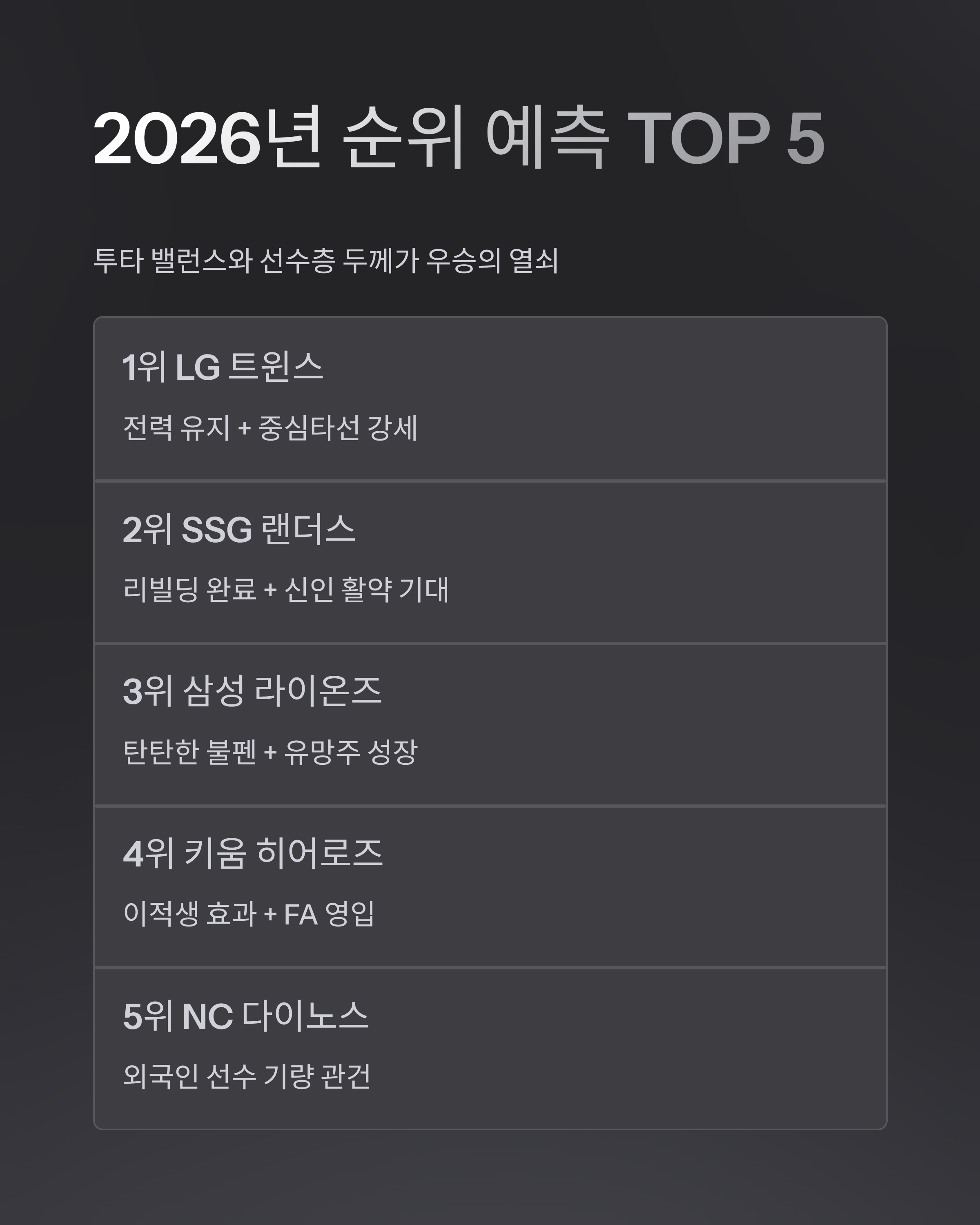 | 1위 | LG 트윈스 | 전력 유지 + 중심타선 강세 |