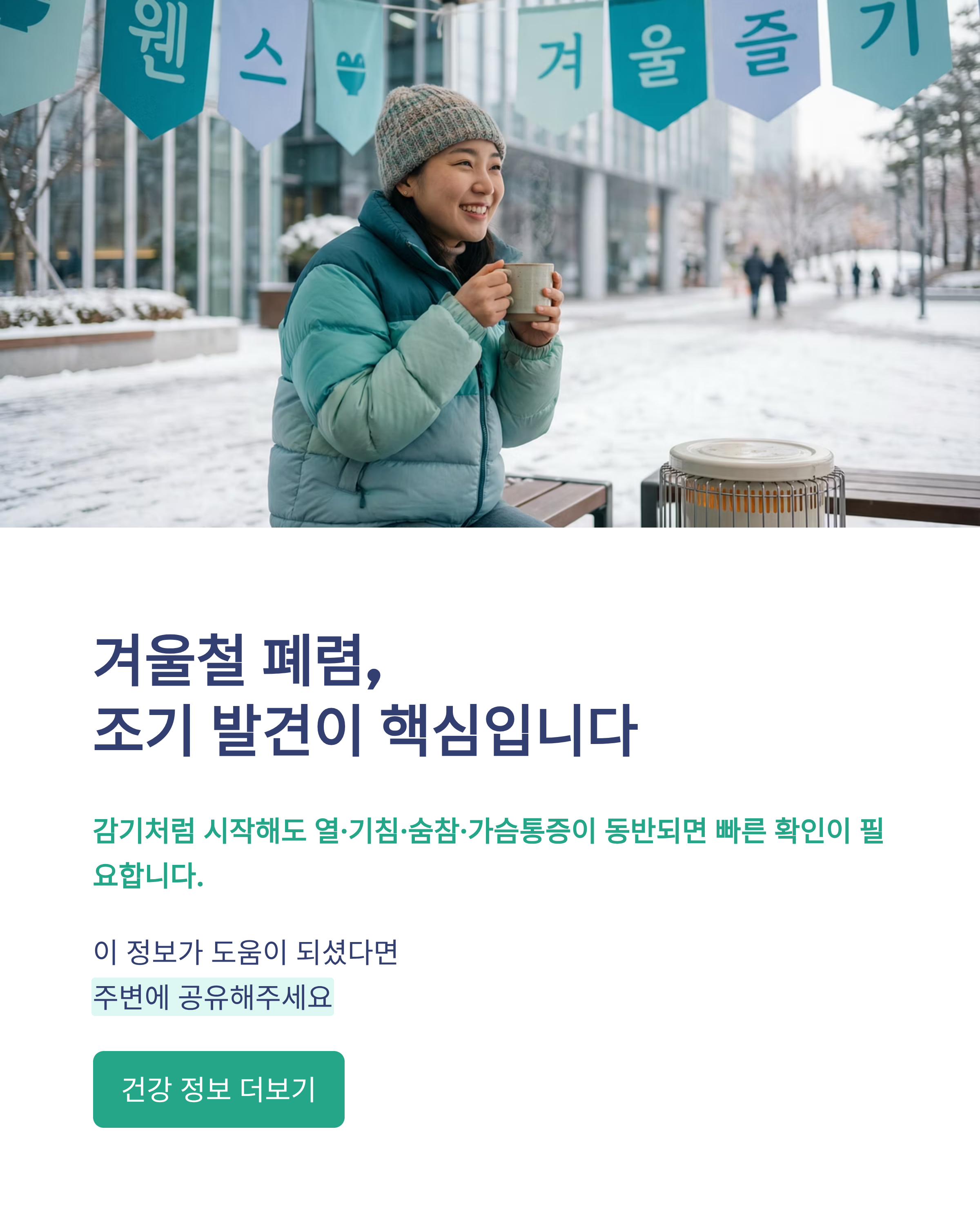 메타 설명: 겨울철 폐렴은 감기처럼 시작해도 열·기침·가래·숨참·가슴통증이 동반되면 빠른 확인이 필요합니다. 폐렴 전염 여부(원인 병원체 전파), 초기증상 체크리스트, 병원에 바로 가야 하는 위험 신호, 2026 겨울 실시간 유행 동향 확인 방법(KDCA 자료)까지 한 번에 정리했습니다.