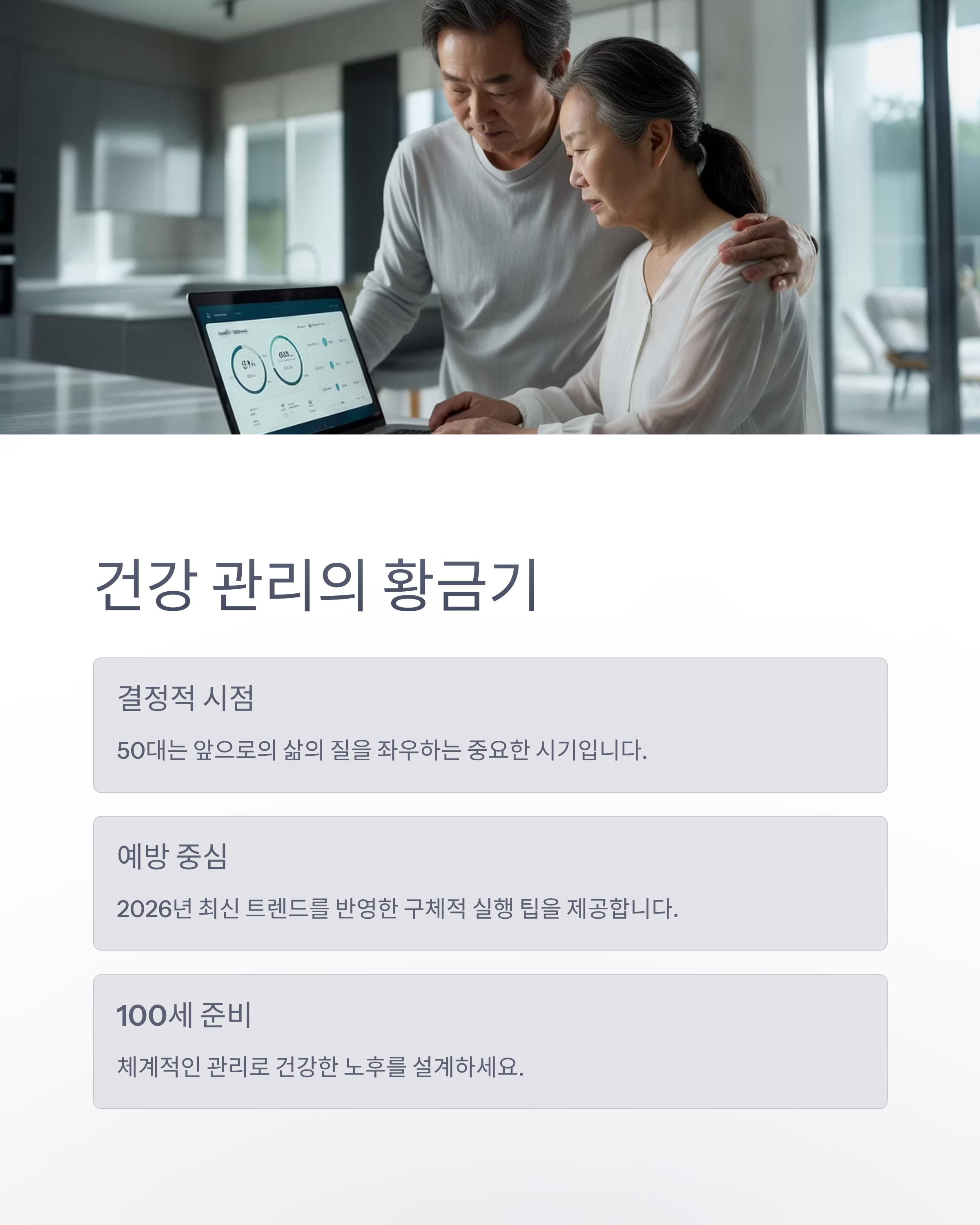 50대는 건강 관리의 황금기입니다. 인생의 중반을 넘어선 시기이지만, 앞으로의 삶의 질을 좌우할 수 있는 결정적인 시점이기도 하죠. 이번 글에서는 2026년 최신 건강 트렌드를 반영한 50대 건강 관리 체크리스트를 정리했습니다. 예방과 관리 중심의 구체적인 실행 팁을 통해 건강한 100세 시대를 준비해보세요.