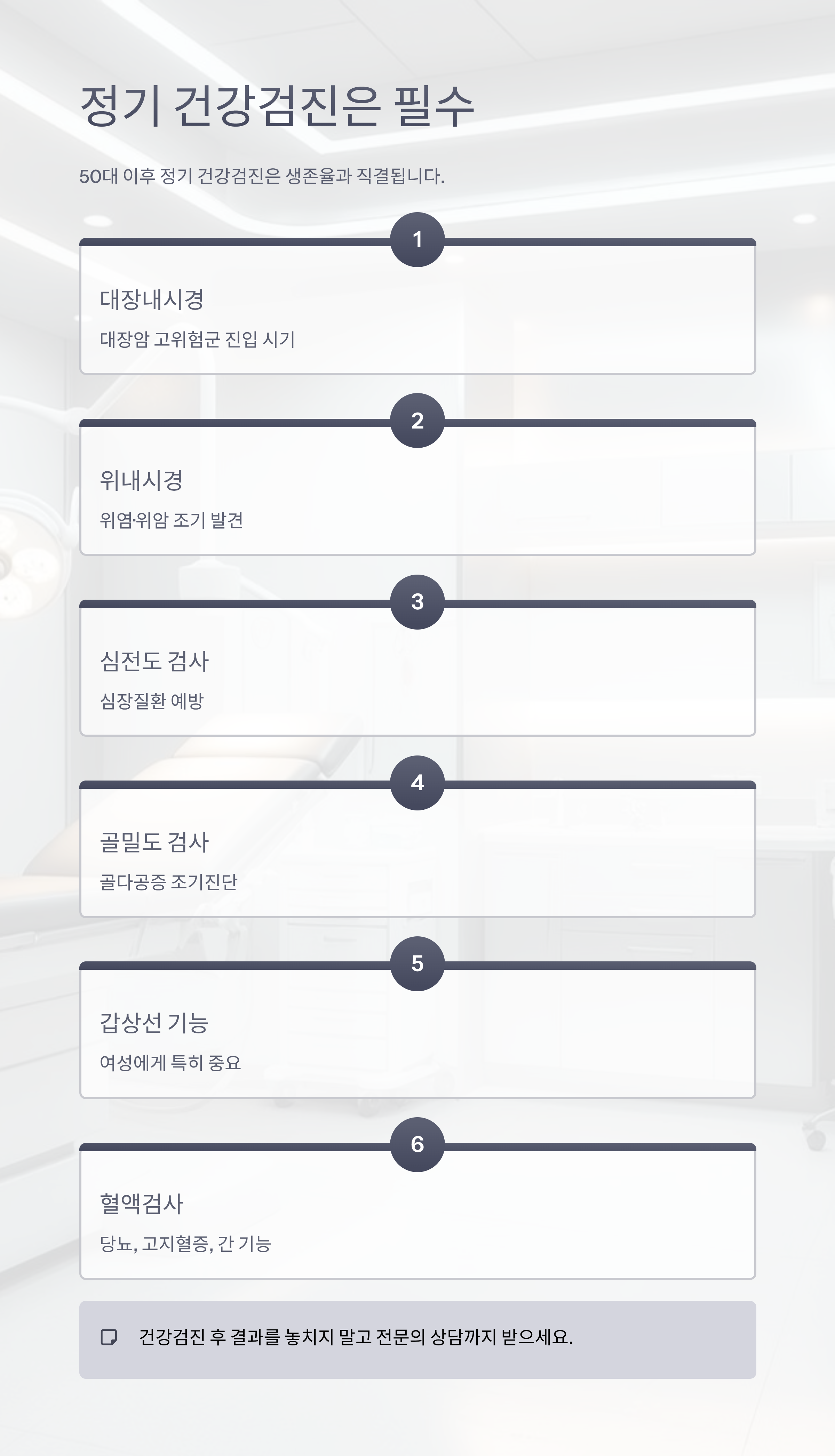 50대 이후에는 정기적인 건강검진이 생존율과 직결됩니다. 특히 다음 항목은 빠짐없이 체크해야 합니다: