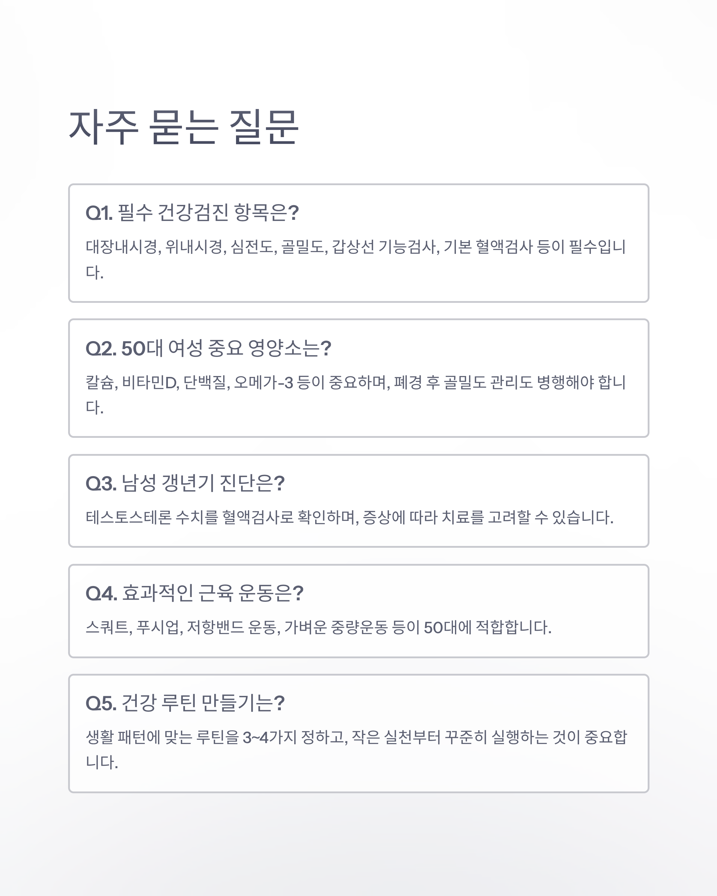 Q1. 50대에 꼭 받아야 할 건강검진 항목은 어떤 것이 있나요?