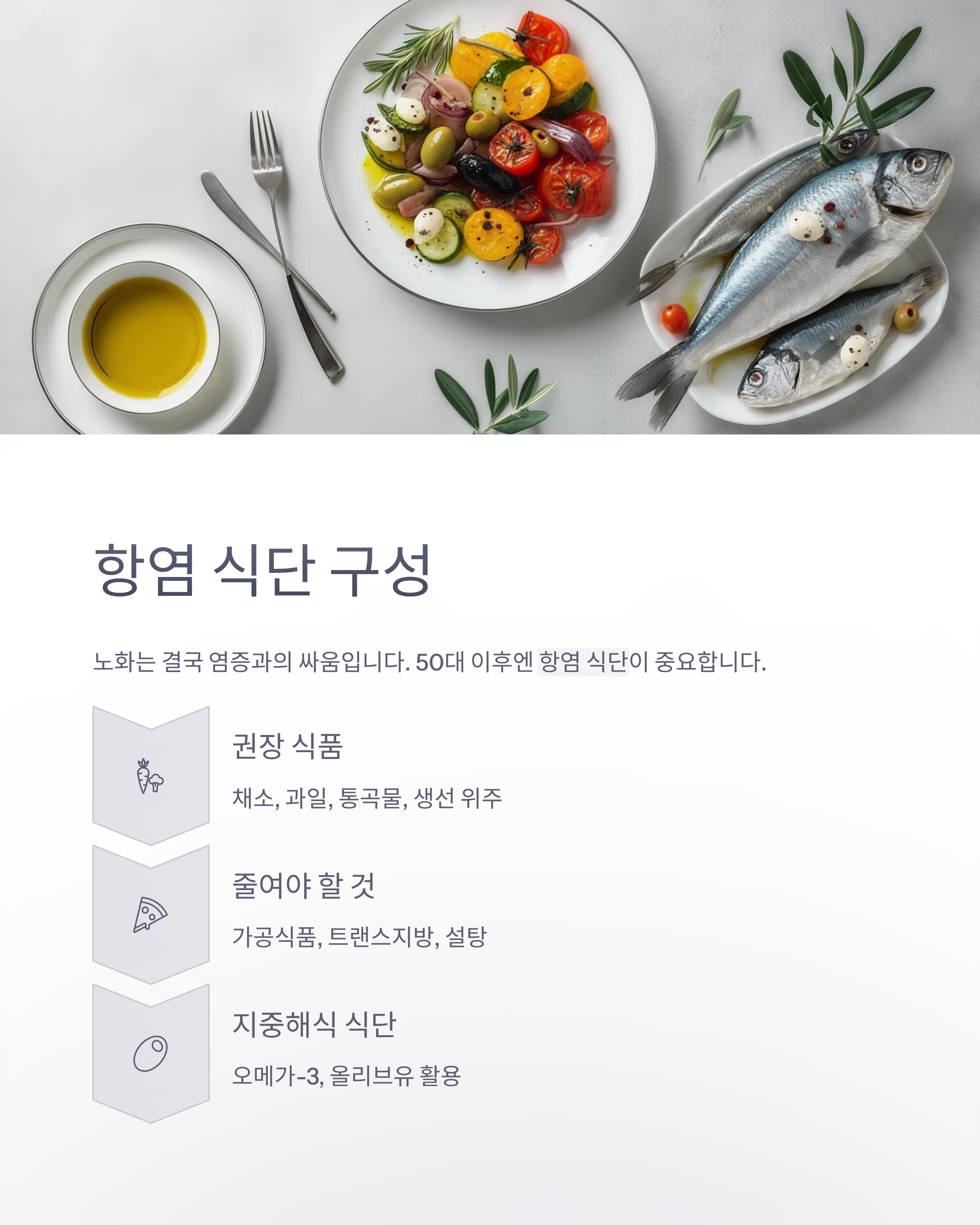 - 지중해식 식단 참고 (오메가-3, 올리브유 활용)