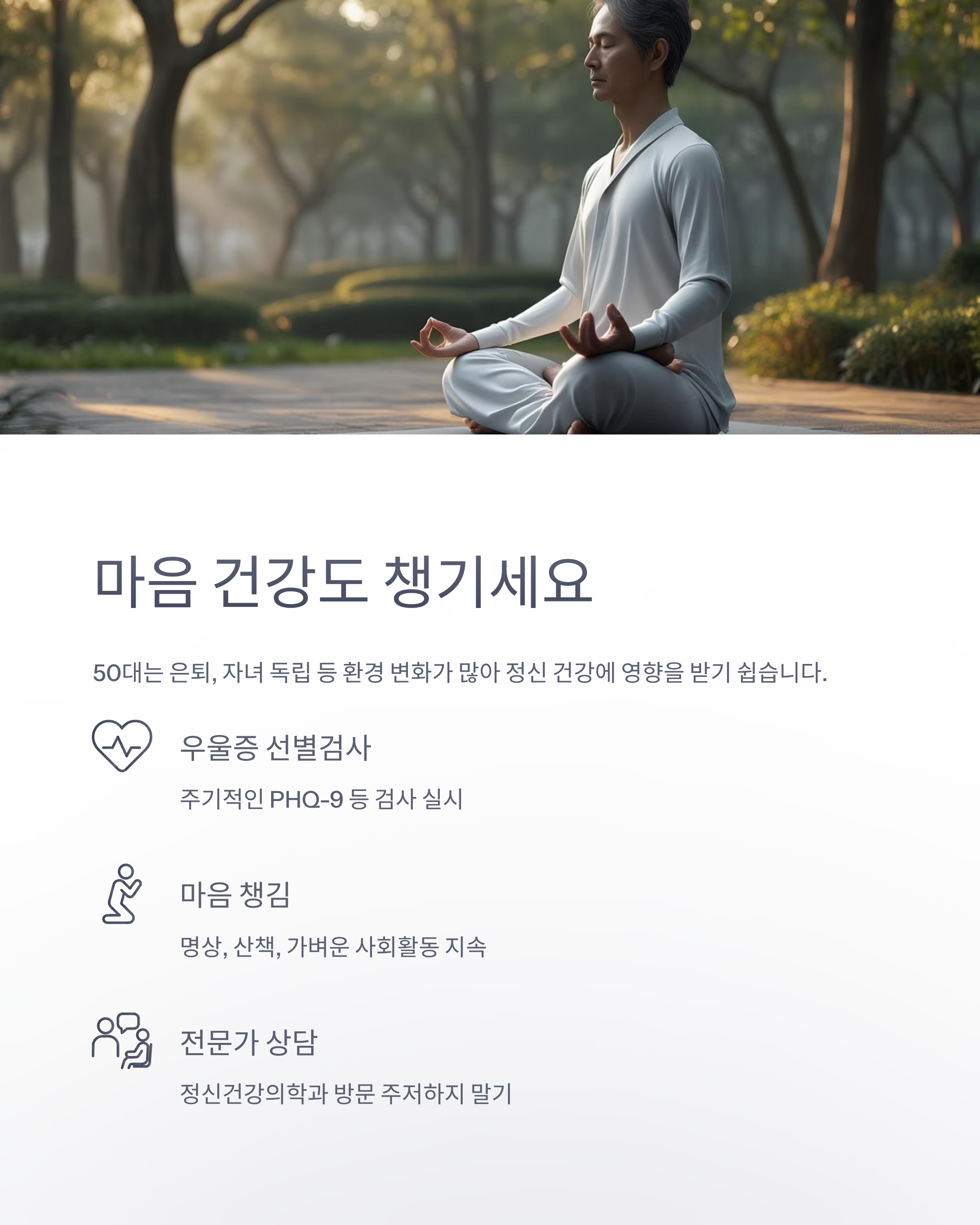 50대는 은퇴, 자녀 독립 등 환경 변화가 많아 정신 건강에 영향을 받기 쉽습니다.
