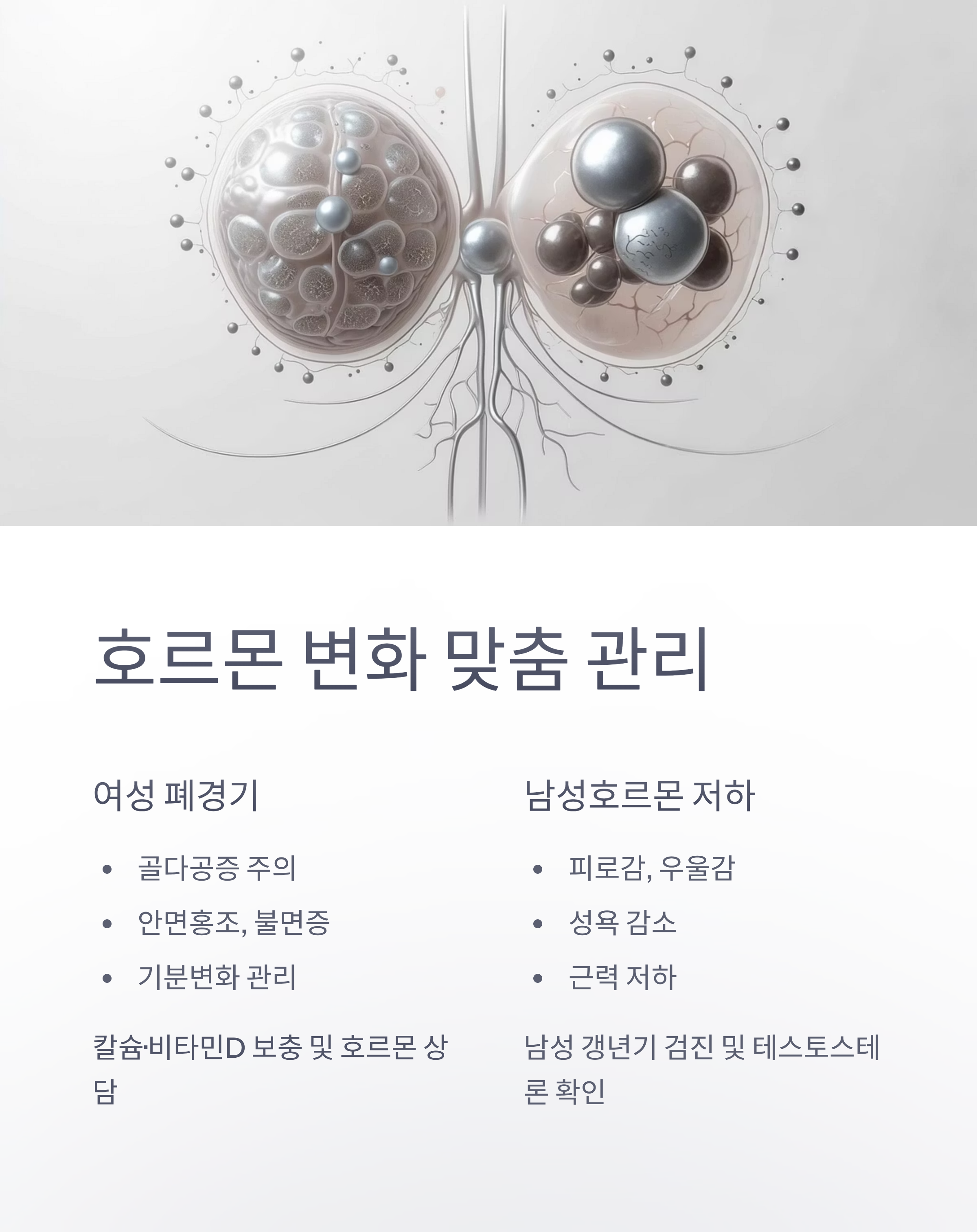 - 여성: 골다공증, 안면홍조, 불면증, 기분변화 등 → 칼슘·비타민D 보충 및 호르몬 상담
